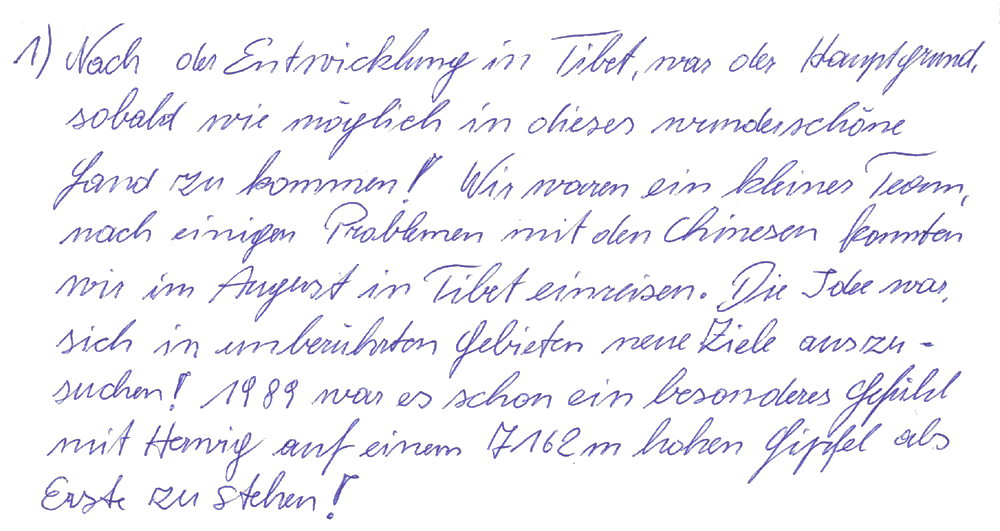 1. Nach vielen schweren Alpentouren und dem Aconcagua als ersten hohen Gipfel ist Ihnen 1989 die Erstersteigung des Nyainqêntanglha-Zentralgipfels, eines über 7000 m hohen Gipfels in Tibet gelungen. Worin lag der Reiz, einen solch exotischen und unbekannten Gipfel anzugehen?