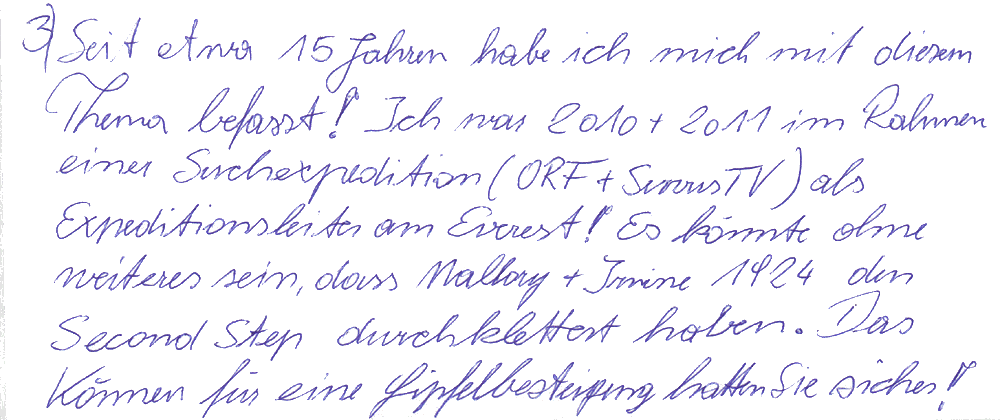 3. Noch einmal Everest: halten Sie es für möglich, dass die Seilschaft Mallory & Irvine schon 1924 den Second Step überklettert haben könnte und unter Umständen doch den Gipfel erreichte? Die Kletterbarkeit mit der damaligen Ausrüstung und der Kletterfähigkeit der beiden Akteure wird ja seit dem Fund von Mallorys Leiche 1999 abermals heftig diskutiert.