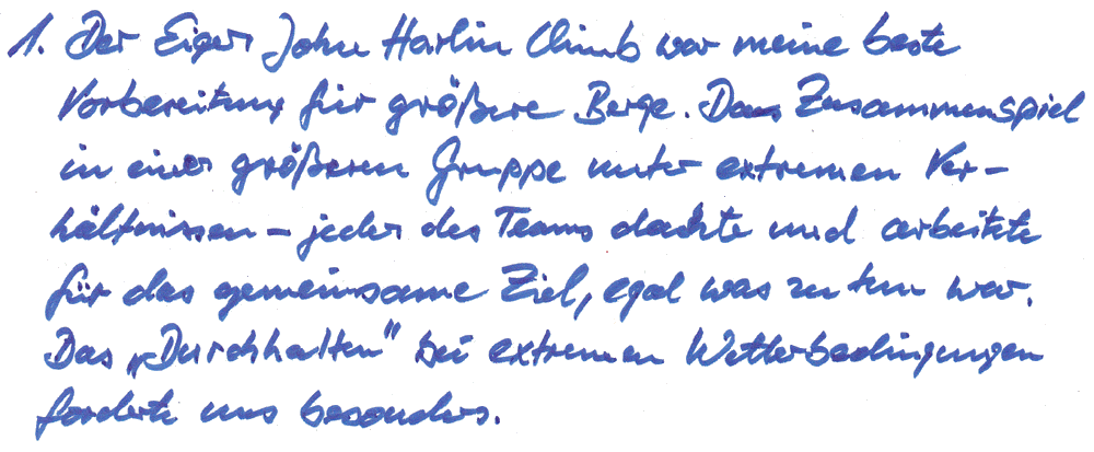 1. . 1966 gehörten Sie zum berühmten internationalen Team, denen – trotz des tragischen Todes von John Harlin II – die Durchsteigung der berüchtigten Nordwand auf einer sehr schweren Direktroute gelang. Wie wichtig ist diese Unternehmung rückblickend für Sie heute – nachdem ja noch so viele Expeditionen und Touren folgten?