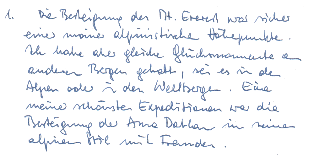 1. Als hervorragender Expeditionsleiter haben Sie sich bei einem weltweiten Publikum einen Namen gemacht, leiteten Expeditionen zum Mount Everest, zu Makalu, Manaslu, Dhaulagiri, Cho Oyu, Ama Dablam und anderen Weltbergen. Den Mount Everest konnten Sie sogar selbst besteigen. War das Ihr alpinistischer Lebenshöhepunkt im wahrsten Sinne des Wortes?