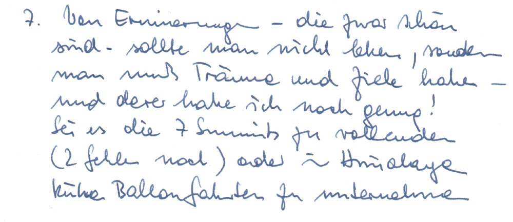 7. Ein vielgereister Bergsteiger wie Sie hat sicher auch heute noch Pläne. Welchen sportlichen Wunsch möchten Sie sich noch erfüllen?