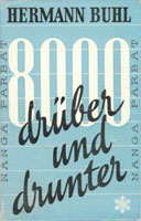 Buhl: "Achttausend - drüber und drunter", Buhl berühmte Biographie mit einem langen Kapitel zum Nanga Parbat 1953. Die EA erschien 1954 in der Nymphenburger Verlagshandlung. Vorsicht: es sind x weitere Auflagen im Umlauf, das Bild links zeigt das Cover der Erstauflage 1954 (ohne Nachwort von Diemberger, welches ja erst nach Buhls Tod 1957 geschrieben wurde). |