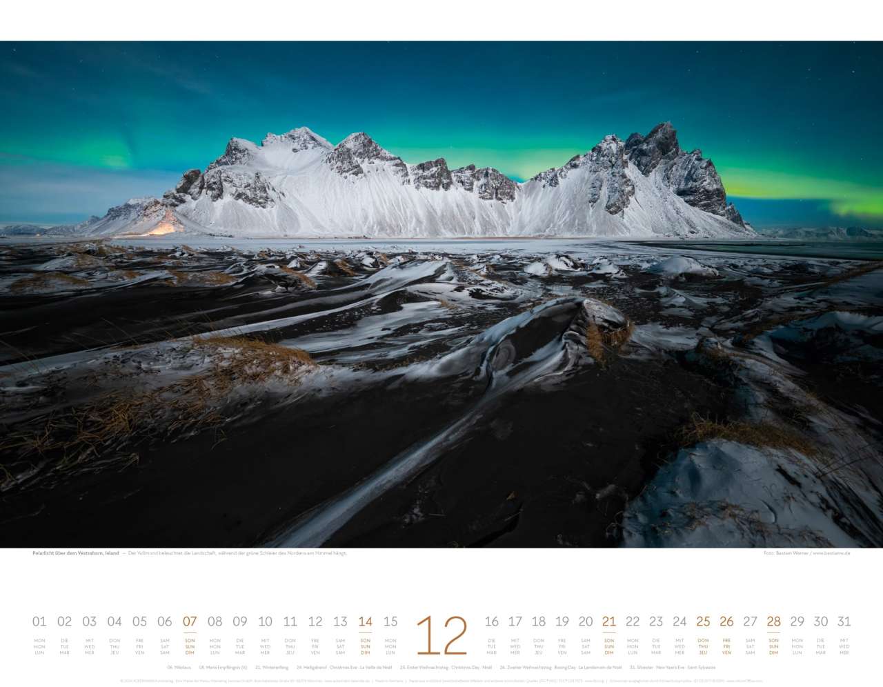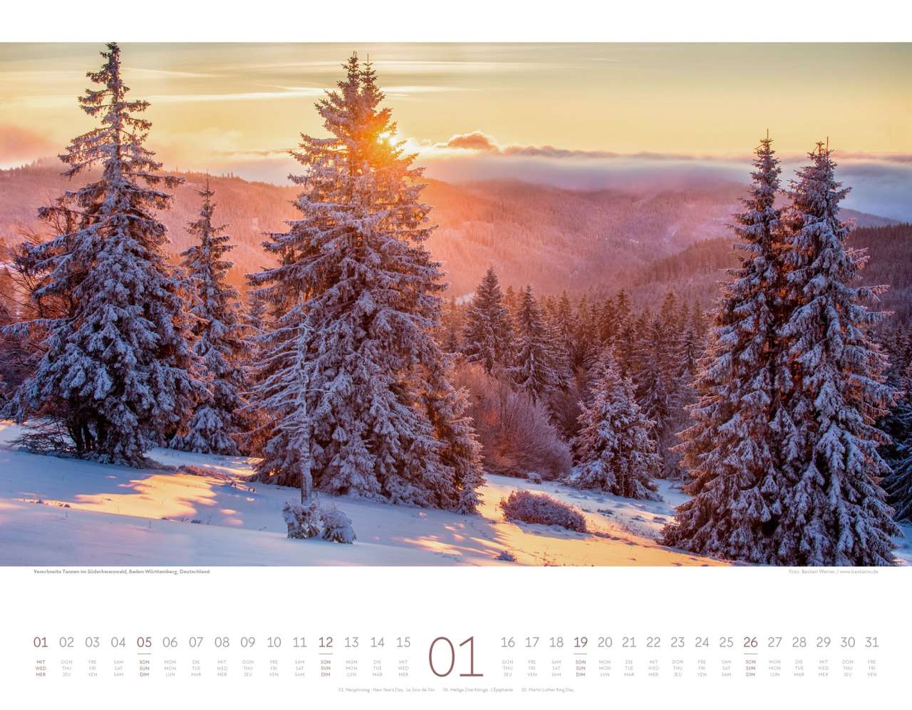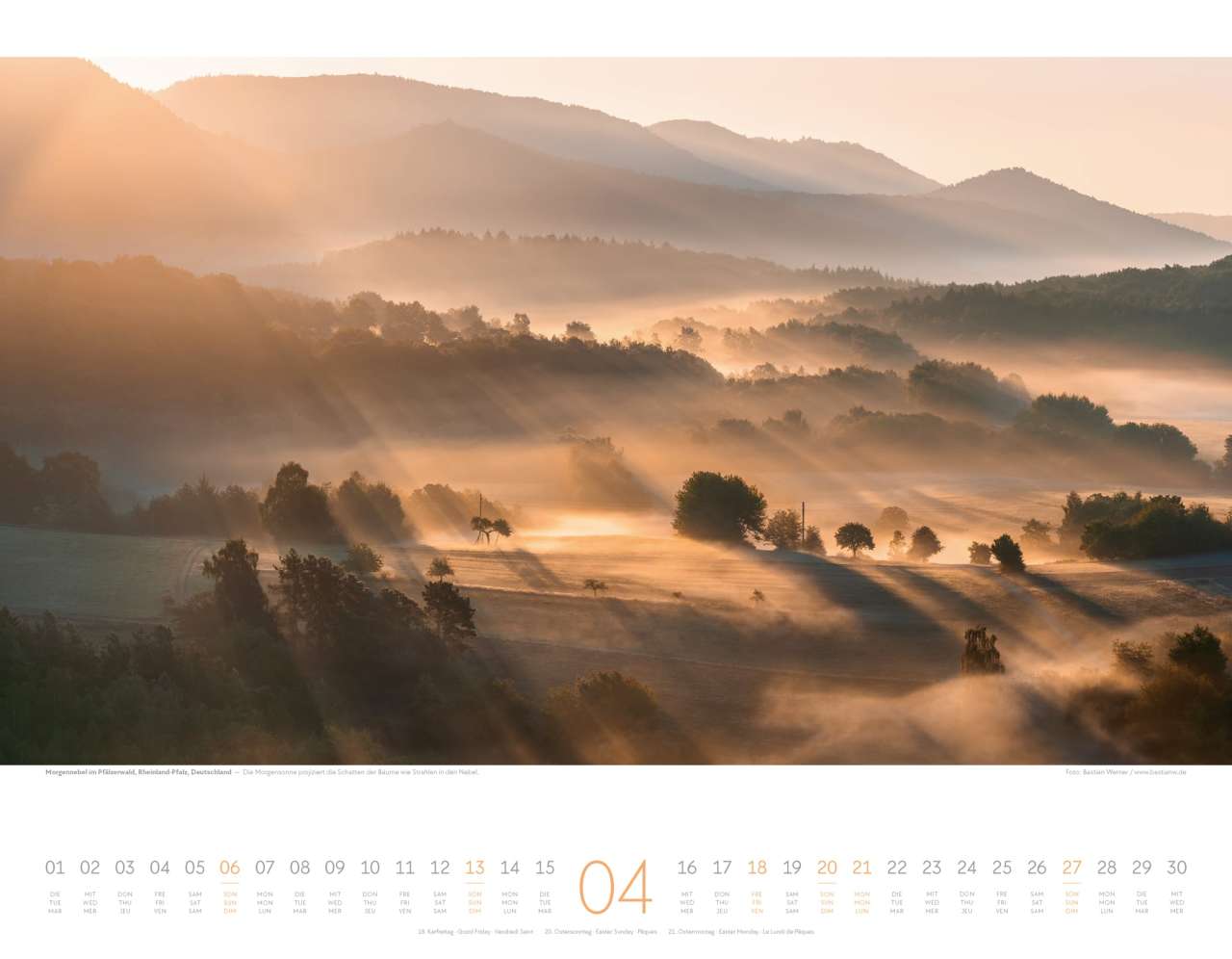 Das Bild steht freilich klar im Vordergrund und liefert einen Monat für Monat wechselnden wunderschönen Wandschmuck. Der Kalenderbalken unten ist dezent und dreisprachig in deutsch, englisch und französisch verfasst. Feiertage sind unterhalb des Kalenderbalkens aufgelistet, oberhalb ist Platz für wichtige Notizen.