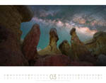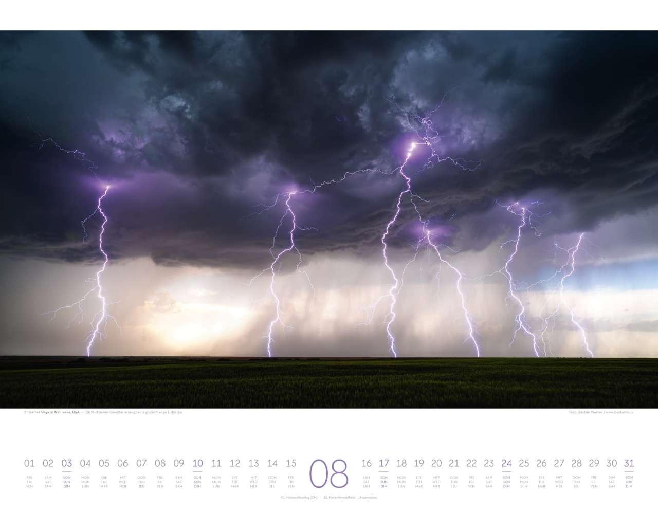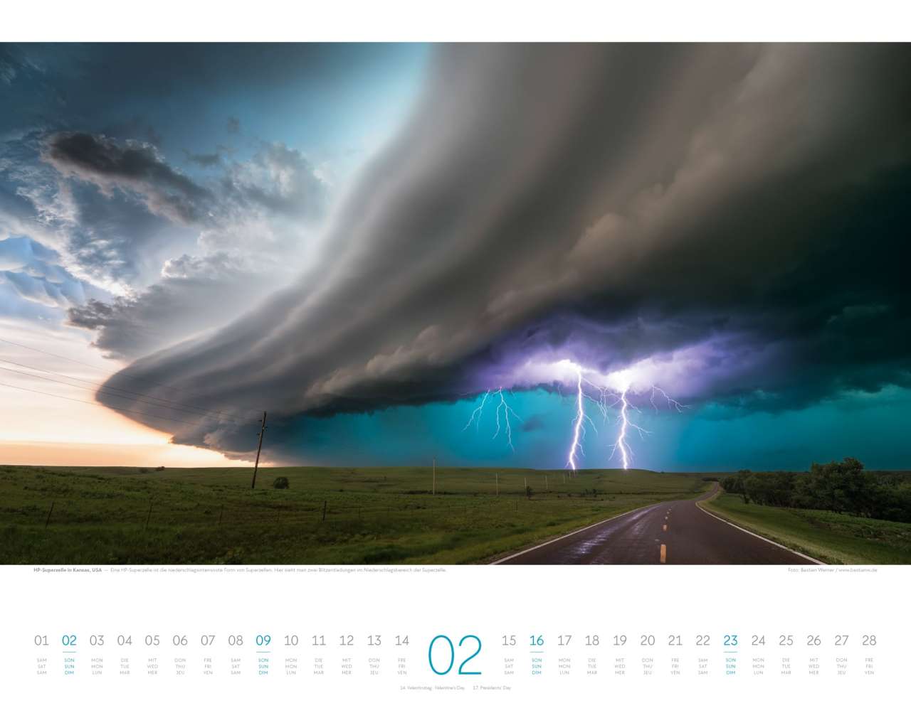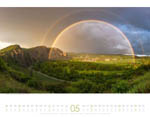Großformatig mit 54 x 42 cm kommt er daher, der neue Naturkräfte-Wandkalender des Ackermann-Kunstverlages, zu dem Bastian Werner, der sich auf die Fotografie von Wetterphänomenen spezialisiert hat, die zwölf Motive beisteuert. "Gewitter, Sturm, Naturgewalten, Vulkane, Blitze" - so lesen sich die Suchbegriffe, zu denen man weitere Produkte finden kann. Klingt gewaltig und gewaltig sind die Naturgewalten, die die Bilder zeigen: ob eine Superzelle in der Tornado Alley in Kansas, ein Lavastrom auf Island oder eine orkangepeitschte See an der Normandie - so wunderschön können die Unbilden der Natur sein. Doch auch sanfte, ja fast zarte Motive können gewaltig wirken, wie zum Beispiel Morgennebel über der Mehlinger Heide, ein nächtlicher Blick in unsere Heimatgalaxie von den Kreidefelsen der Paint Mines aus oder ein Doppelregenbogen über dem Rotenfels in Rheinland-Pfalz.