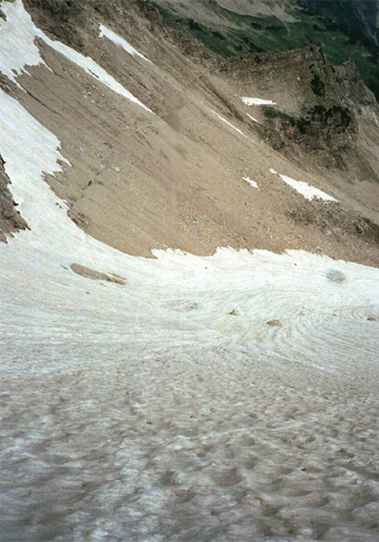 aufgenommen und zeigt den Weg durch das Firnfeld. Unterhalb des oberen