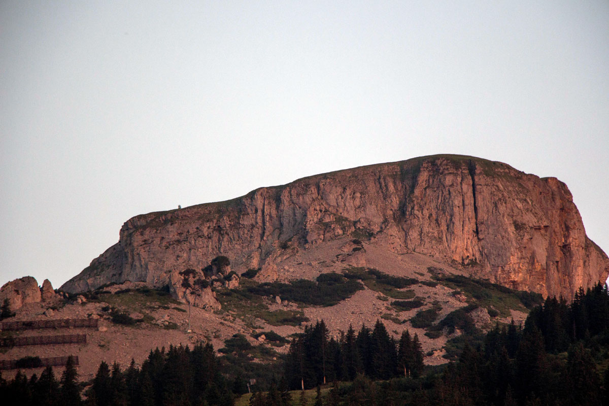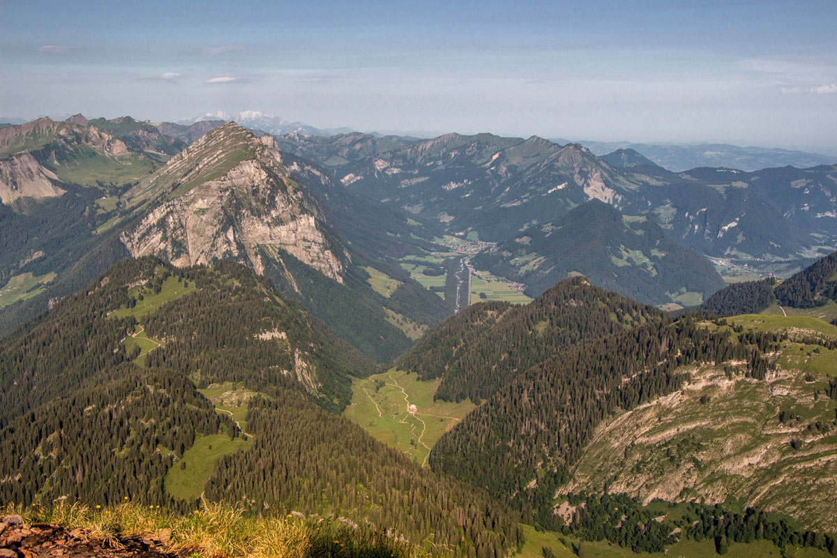 Nun erst einmal den Puls beruhigen, trinken, Gipfelschnäpsle, Fotos machen und dringend die Sonnenmilch nutzen. Eine wirklich schöne Aussicht bietet sich da, natürlich besonders prachtvoll in die Bergwelt des Bregenzer Waldes und die entsprechenden Tiefblicke ins Tal. Gegenüber grüßen prominente Gipfel wie Kanisfluh, Zitterklapfen oder Hochkünzelspitze, doch auch die Berge des Kleinwalsertals setzen sich in Szene. Der Ifen mal aus einer völlig anderen Perspektive.