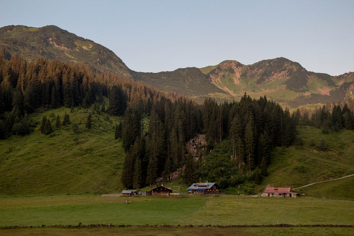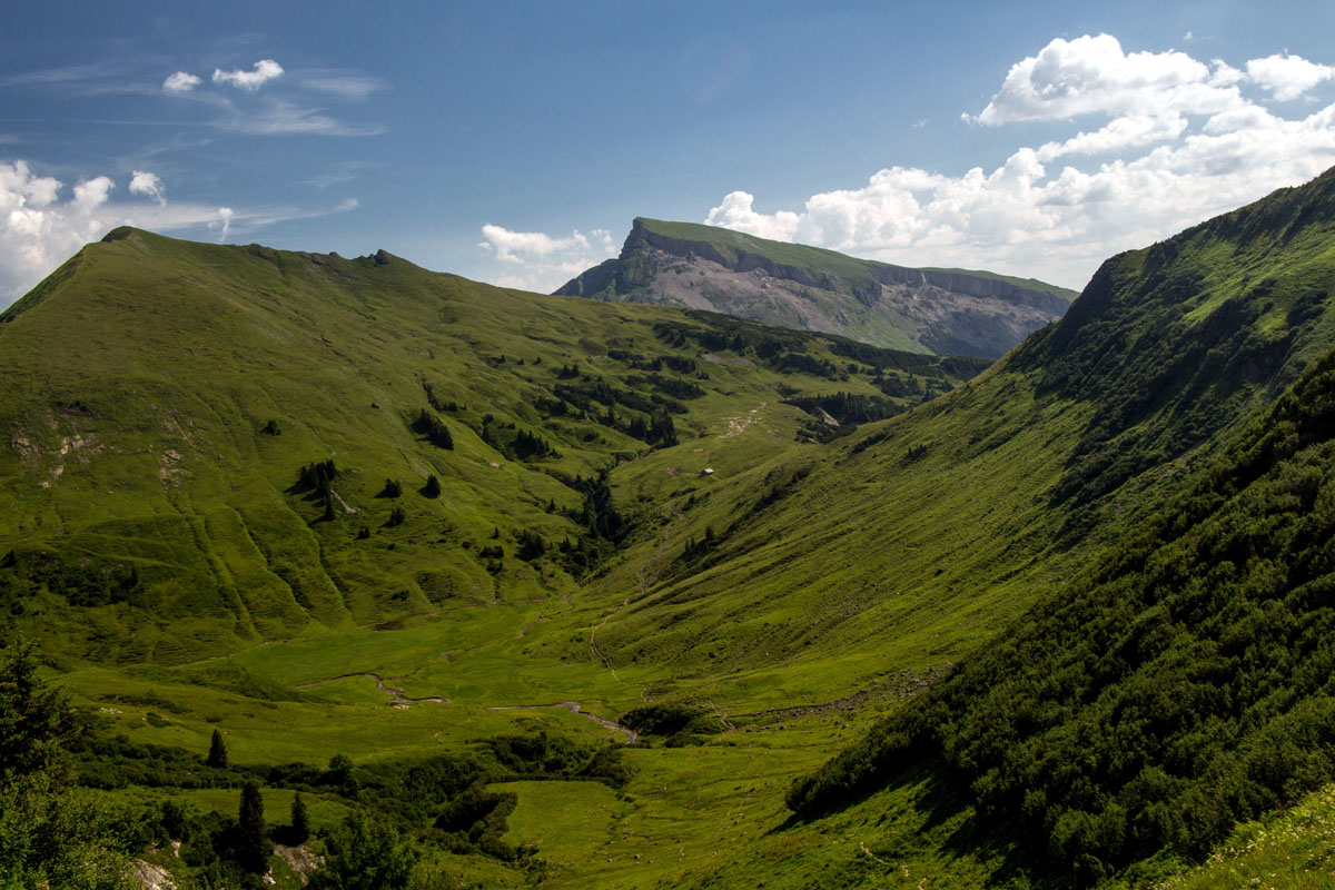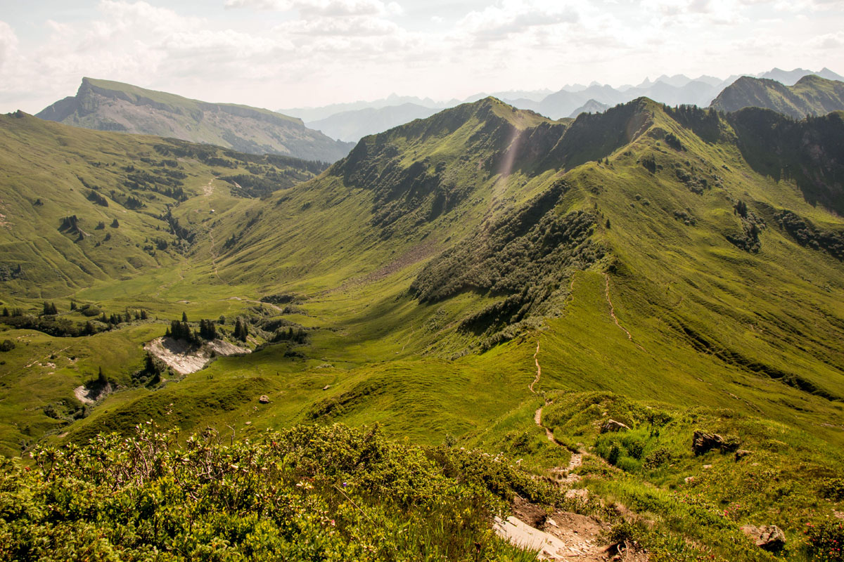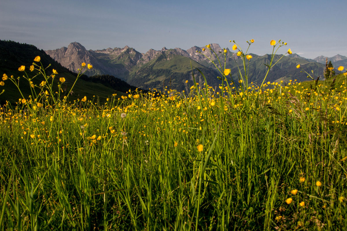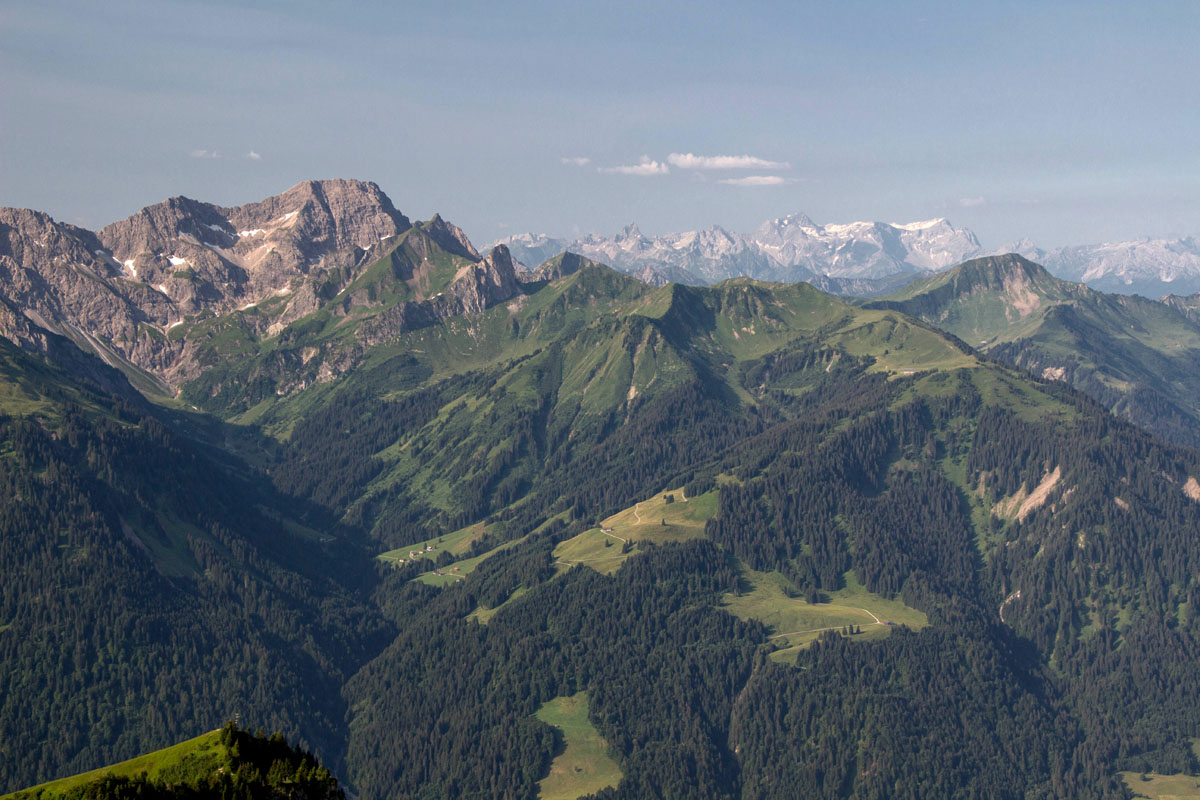 Sommeridylle pur: links der Falzer Kopf, rechts der Bildmitte der Diedamskopf. Die dominierende Farbe der Tour ist Grün ;-)