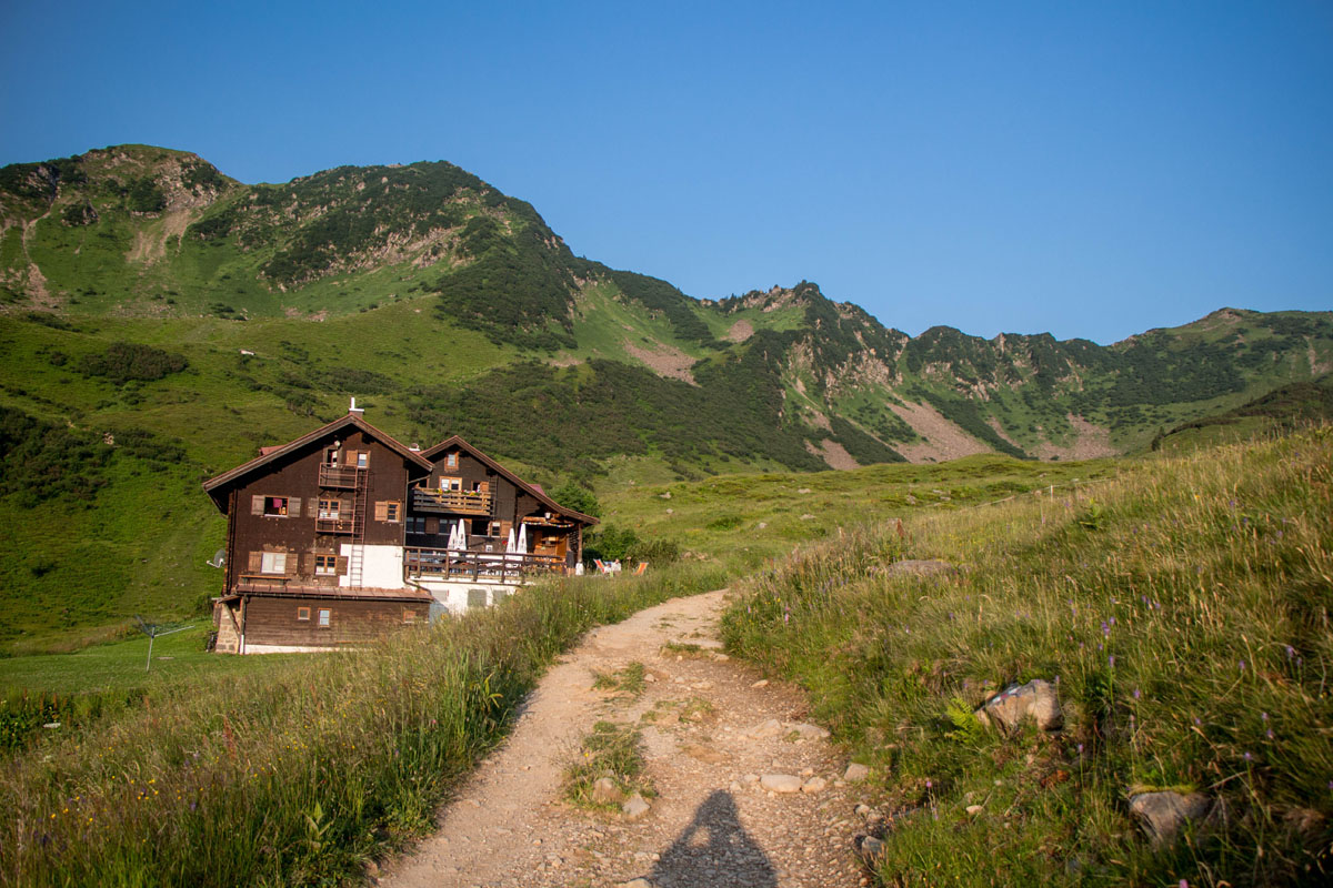 Ich komme gut ins Schnaufen, bin dafür aber auch gegen 6:45 Uhr an der Schwarzwasserhütte auf 1651 m. 50 min. für Etappe 1, nun bin ich zuversichtlich, bis 8:30 Uhr am Gipfel zu sein. Ich fülle meinen Flüssigkeitshaushalt auf und habe Glück, dass ich etwas kaufen kann, denn auf der Hütte ist gerade das Frühstück in vollem Gange und die Gaststube geschlossen.