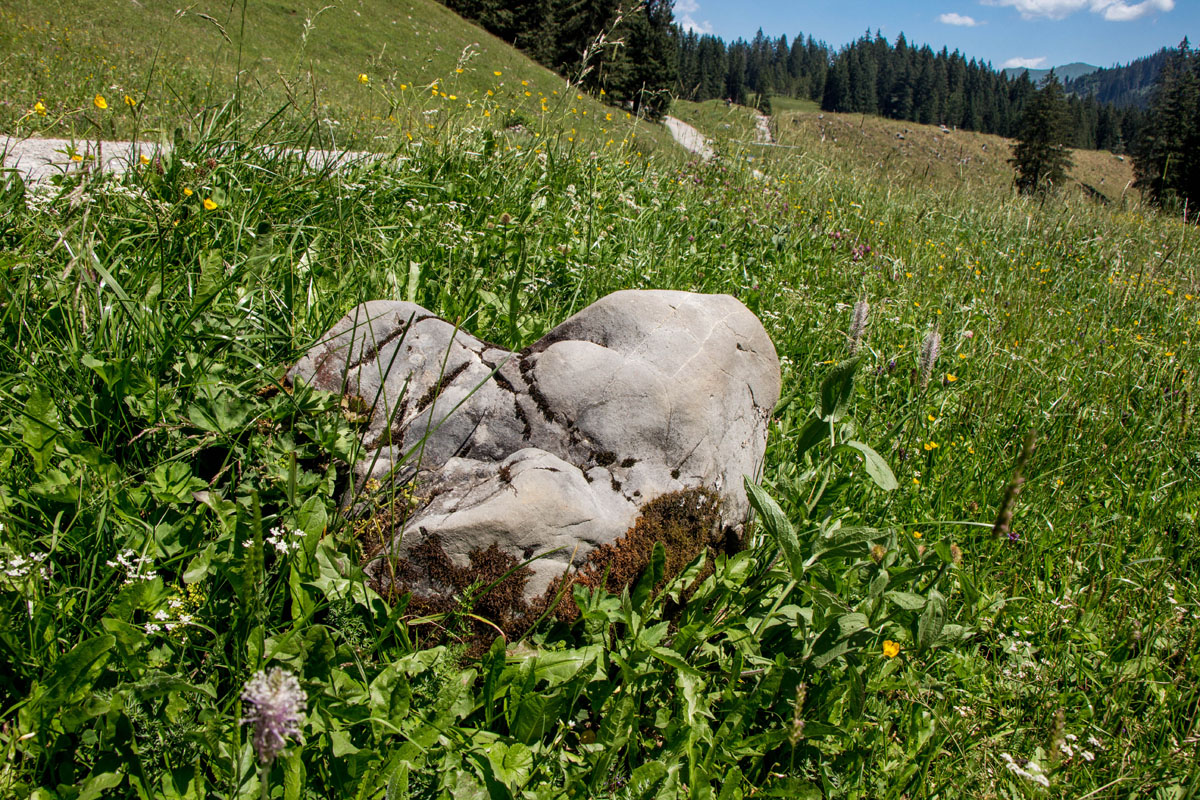 Den Abstieg gestalte ich geruhsamer: es ist noch früh, nun ist Zeit für mehr Muße und weniger zügiges Gehen. So bin ich nach einer guten halben Stunde wieder am Kreuzle und nehme den hier mit einer Stunde ausgeschilderten Falzer Kopf in Angriff.