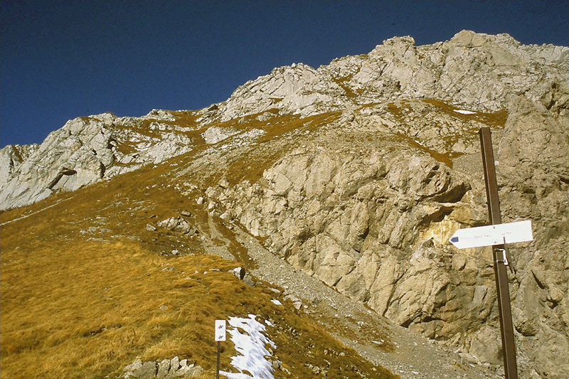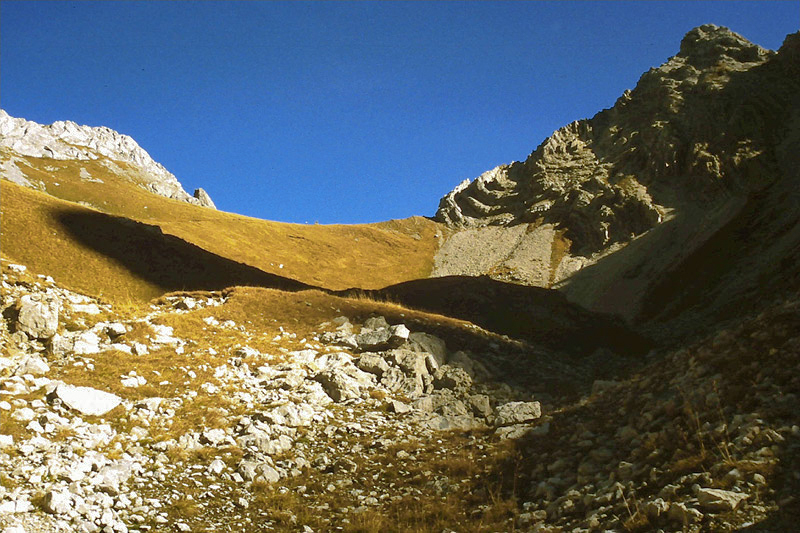 Nach etwa halbstündiger Pause nehme ich wieder den Abstieg in Angriff - so habe ich genug Zeit für den Abstieg ins Tal. Über die Steigspuren erreicht man dann auch sicher die Bockkarscharte, ohne sich im sonst weglosen Gelände zu verlaufen. Schwierig würde es aber auch nicht werden, würde man die Steigspuren nicht finden: ein mittelsteiler Hang, der aufgrund des Grasbewuchses höchstens bei Nässe unangenehm werden könnte. An der Bockkarscharte mache ich nochmals kurze Pause und starte kurz nach 13 Uhr meinen weiteren Abstieg zur Hütte. Es ist doch für Ende Oktober ungeheuer warm, man kommt ganz schön ins Schwitzen. Selbst oben auf dem Gipfel war es teilweise fast windstill. Eben ein perfekter Spätherbsttag!