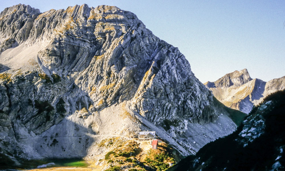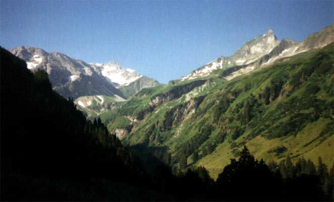 Ich gehe diesmal nicht die asphaltierte Straße taleinwärts, sondern quere über einen Waldweg direkt unterhalb des Giebels, während ich die herrlichen Blicke auf die sonnenbeschienen Gipfel genießen kann. Der Weg nimmt zwar wenige Minuten mehr in Anspruch (wirklich nur sehr geringfügig), ist dafür aber auch nicht so monoton zu gehen wie die Straße, die sonst, gerade im Sommer, die meisten nehmen.