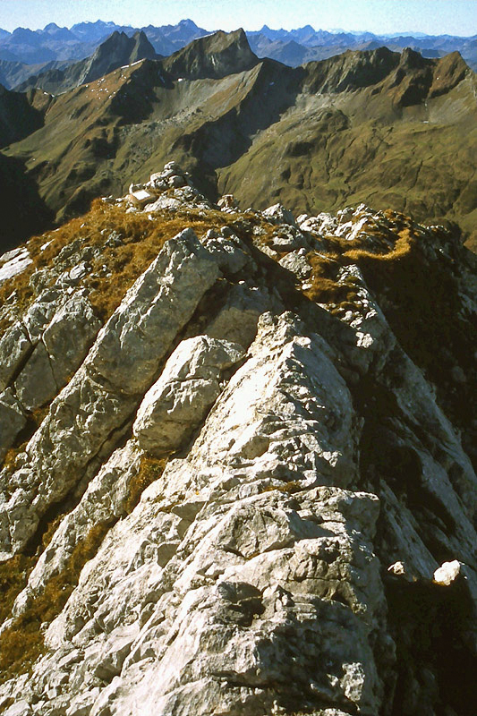 Nach Fotopause und Stärkung nehme ich um Punkt 12 den restlichen Aufstieg in Angriff und steige den Grashang direkt vor mir hinauf. In ziemlich direkter Falllinie des Hangs steige ich höher, was extrem ermüdend ist, bis ich schließlich auf Steigspuren stoße, an denen ich mich im Folgenden orientere. So komme ich besser vorwärts und erreiche wie im AV-Führer angegeben, schließlich den Gipfelgrat. Die Sicht wird nun auch nach Norden frei. Unmittelbar vor dem Gipfel die eigentliche "Schlüsselstelle" des Anstiegs, die im Führer mit "über eine schmale Stelle (I) auf den Gipfel" beschrieben ist. Es handelt sich um eine schmale Gratrippe, die man am besten in Aufstiegsrichtung auf der linken Seite quert. Um 12:14 Uhr erreiche ich den Gipfel und kann die Traumsicht genießen: unzählige Gipfel des Allgäus und des Alpenhauptkamms sind zu sehen, alles glasklar und herrlich scharf.