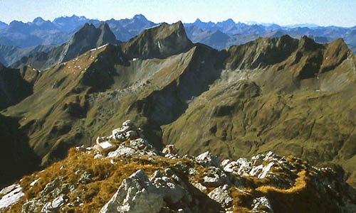 Gipfelpanorama vom Hochvogel bis zur Daumengruppe.