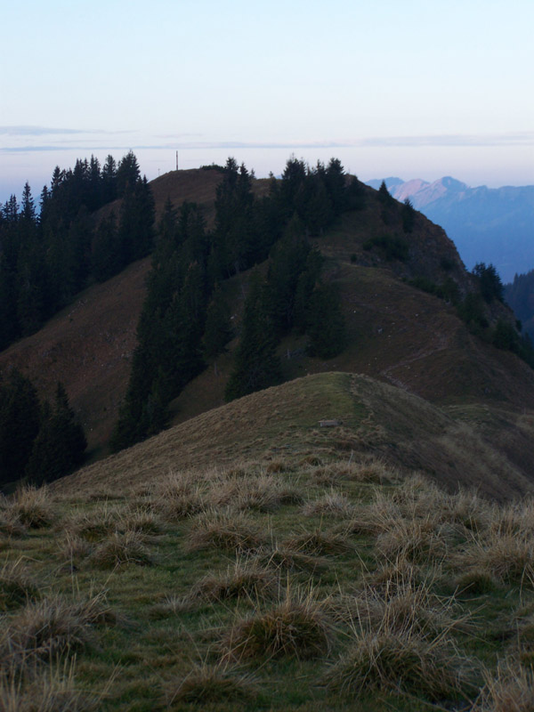 Kurz darauf habe ich den Gipfel des Spieser (1651 m) erreicht, als dessen Gipfelkreuz unvermittelt vor mir auftaucht. Es sind 7:32 Uhr. Ich mache einige Gipfelfotos, trinke einen Schluck, schaue in die Ferne. Um 7:40 Uhr mache ich mich aber auf den Weiterweg: nur wenige Meter geht es seicht in den Sattel zwischen Spieser und Großem Hirschberg hinunter, da steigt der Weg schon wieder an. Da der Weg im weiteren Verlauf nicht über den Gipfel führt, steige ich auf direktem Weg über die Grasmatten bergan. Hierbei queren eine ganze Reihe Gemsen meinen Weg. Nur acht Minuten nach meinem Aufbruch am Spieser bin ich am Gipfel des Großen Hirschberg (1644 m) – ein ziemlich vermessener Name für einen solch unauffälligen Grasrücken.