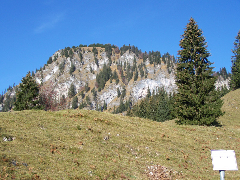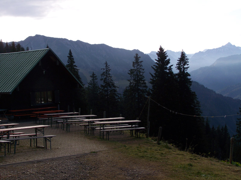 Die Hirschalpe liegt zum Greifen nah unter mir. Ich bin mir im Unklaren, wie ich absteigen soll: entweder vom Ornachkreuz direkt nach Oberjoch und von dort zum Parkplatz an der Jochstraße oder auf dem Aufstiegsweg über die Hirschalpe. Um 8:55 Uhr verlasse ich den Gipfel wieder und entschließe mich gegen einen Direktabstieg nach Oberjoch. Auf bekanntem Weg steige ich also ab und bin nach einer halben Stunde Abstieg wieder an der Hirschalpe (9:25 Uhr).