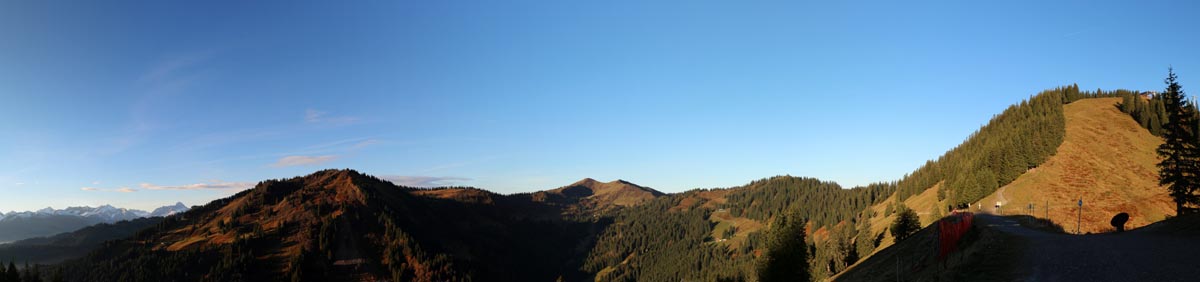 Ein kleiner Gipfel und die einzige Bank ist besetzt – so mache ich nur kurz Pause und verabschiede mich nach fünf Minuten wieder und mache mich an meinen Talabstieg. Nach einem kleinen Abstecher in die versehentlich falsche Richtung steige ich durch wieder gut gestuften Wald ab, stets die nächste Markierung vor Augen, so dass man sich kaum verlieren kann. Ich nutze den Höhenmesser meiner Uhr und sehe, wie ich zügig an Höhenmetern verliere. Nach einer halben Stunde Abstieg treffe ich auf einen breiten Fahrweg, den ich rechts talwärts folge. Etwas monotoner das Ganze, aber es geht so natürlich auch etwas zügiger. Als ich die Abzweigung Richtung Zunkleiten-Alm erreiche, gehe ich weiter talwärts (rechts abbiegen!) weiter. Immer Richtung Sonderdorf halten. Nach kurzer Zeit bin ich an der Abzweigung „Tobelweg“, da ich aber keine Lust auf Schatten und rutschiges Laub habe, folge ich dem Hauptweg. Dummerweise auch dann, als nach einigen Kehren wieder eine Abzweigung Richtung Hörnerbahn-Talstation links ab in den Wald führt. Dies wäre eine klare Abkürzung zu meinem weiteren Weg gewesen. So geht´s weiter bergab, um dann nach einer Schleife vor Sonderdorf wieder zum „Bergblickweg“ (ein schön angelegter Weg, den man bis Kierwang verfolgen kann) anzusteigen. Einerseits wegen meines offensichtlichen Umwegs genervt, andererseits mit schönen Ausblicken vor Augen gehe ich zügigen Schrittes Richtung Hörnerbahn-Talstation. Man fragt sich schon, wo denn Bahn und Talstation sein sollen, da sieht man dann plötzlich die Bahn unmittelbar vor sich und ist zwei Minuten später auf dem Parkplatz der Talstation. Dieser ist inzwischen natürlich gut gefüllt. Um punkt 14:00 Uhr bin ich am Auto und freue mich über die landschaftlich so schöne und meist sogar einsame Tour, die hinter mir liegt.