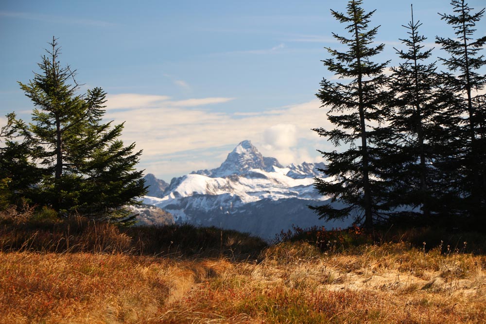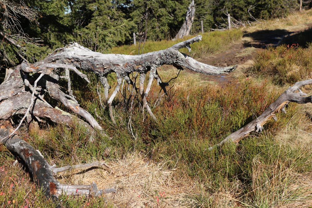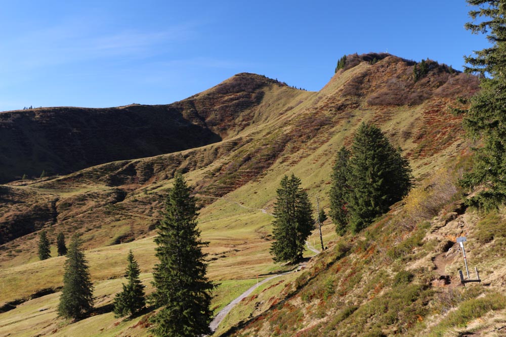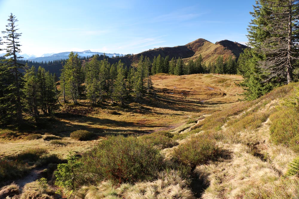 Auch auf diesem Gipfel werden natürlich Fotos gemacht und ich genieße den schönen Blick hinüber zum Riedberger Horn, meinem nächsten und höchsten Ziel für heute. Etwa 10-15 min. mache ich Pause, dann geht es weiter, zunächst hinab in ein flaches, kleines Hochmoorgebiet, in dem ein gutes Auge für den richtigen Tritt völlig zugesaute Schuhe verhindert. Es ist aber eben auch sehr idyllisch hier mit dem lichten Bewuchs, den Sträuchern und der insgesamt herbstlichen Stimmung. Eine Genusstour, bei der man die Blicke schweifen lassen kann.