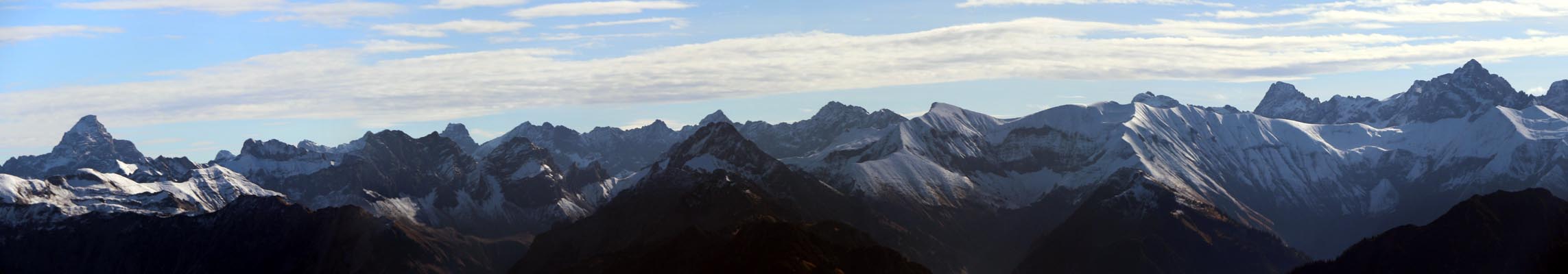 Abbildung: Telepanorama-Ausschnitt vom Riedberger Horn vom Hochvogel über Wildengruppe, Höfats, Rauheck und Kreuzeck zur Hornbachkette.