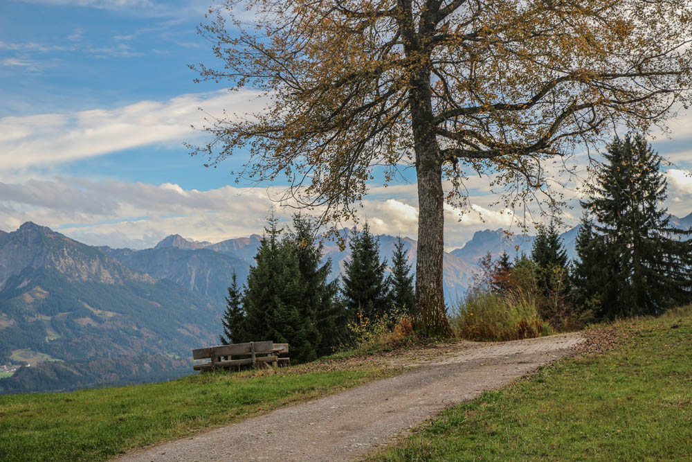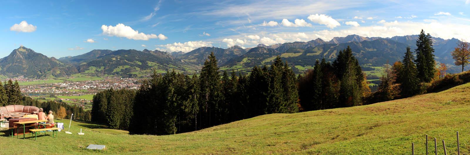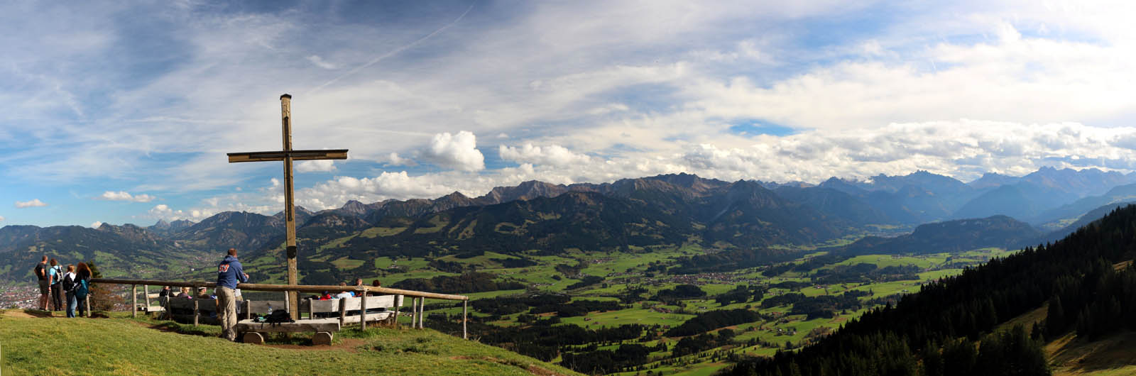 Die Aussicht ist auch hier schön, das Wetter noch gut, obschon im Süden bereits dichtere Wolken zu sehen sind. Ich gönne mir eine Pause, trinke, esse, fotografiere, schaue in die Runde. Ein wirklich schöner Rundumblick, den man von hier oben, trotz der bescheidenen Höhe hat: der Blick schweift vom Grünten über das Ostrachtal und Illertal zu den Oberstdorfer Bergen, der südlichen Hörnergruppe (die ich 2013 erwandert habe) bishin zur Nagelfluhkette. Deren Überschreitung steht auch noch auf meiner Wunschliste. Dann gehts an den Rückweg. Während des Abstiegs mache ich es mir nochmals an einer einsamen Bank gemütlich. Wenn das schon die letzte Solo-Bergtour für 2014 ist, dann soll die nochmals genossen sein. Und da die letzte Talfahrt der Bergbahn inzwischen näher rückt, wird es hier allmählich ruhiger. Ich genieße vor schöner Aussicht mein letztes Fläschchen „Hindelanger Kräuterschluck“ – war mir doch etwas blöd, vor den Augen anderer am Gipfel mein traditionelles Gipfelschlückchen auszupacken.