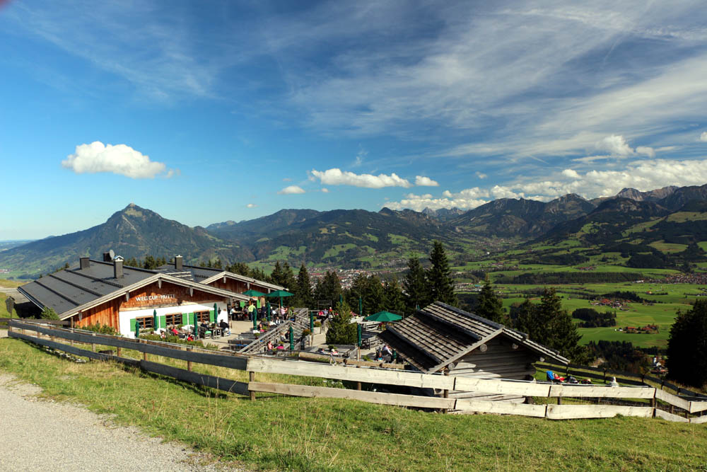 Am Dienstag, den 14. Oktober unternehmen wir vormittags "im Familienverbund" eine Wanderung am Iseler, fahren wie schon so oft mit der Bergbahn hinauf, um dann den schönen Weg bergab nach Oberjoch zu wandern. Wieder daheim in der Ferienwohnung hält mich nach dem Mittagessen nichts mehr – ich muss raus, das Wetter ist nach wie vor super. Der Rucksack ist im Handumdrehen gepackt und mit dem Auto geht es dann über Sonthofen nach Ofterschwang, wo ich an der Talstation der Hörnerbahn parke. Schon hier kann man einen wunderschönen Blick ins Illertal Richtung Oberstdorf genießen. Es ist etwa 12:45 Uhr. Ab hier geht es auf gutem, breitem Weg an der Wurzelhütte vorbei aufwärts. An einem kleinen Wildgehege entlang steige ich höher, nehme dann aufgrund einer etwas verwirrenden Ausschilderung den falschen Abstecher, was mich gut zehn Minuten Zeit kostet. An sich nicht schlimm, aber ich wollte – da die Tour als solche keine großen sportlichen Herausforderungen bietet – zumindest ein wenig auf Tempo steigen, also möglichst rasch auf den ersten Gipfel. Naja, ganz so ernst nehme ich die Sache nicht mehr, aber schleichen muss man nun auch nicht. Um 13:30 Uhr bin ich an der schön gelegenen Hochbichl-Hütte, mache ein kurzes "Trink-Foto-Hüttenstempel"-Päuschen und nehme dann die verbleibende Wegstrecke zum Ofterschwanger Horn unter die Füße.