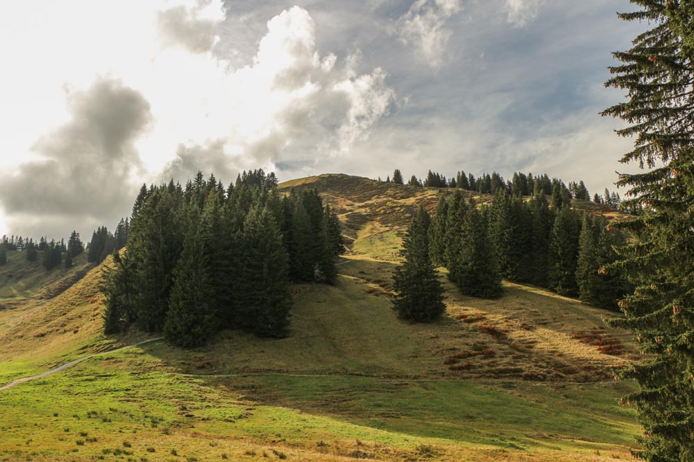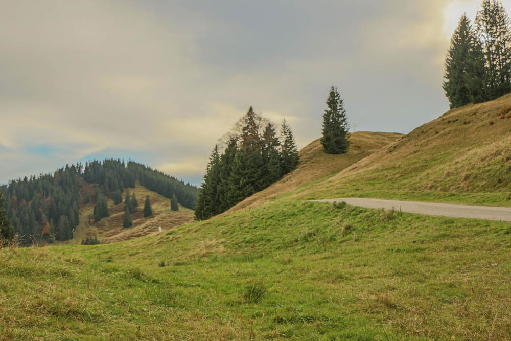 Nach einer Pause steige ich zügig in die Scharte zwischen Rangiswanger- und Ofterschwanger Horn ab und erreiche kurz darauf die inzwischen geschlossene Fahnengehrenalpe. Das Rangiswanger Horn lasse ich rechts liegen. An sich wollte ich da noch rauf, aber der Gipfel liegt im dichten Wald, sehen tut man da oben eh nichts. Außerdem sind die Wiesen noch vom gestrigen Regen aufgeweicht, und da kein Weg hinaufführt, habe ich keine Lust, durch die Matsche zu steigen, um dann oben nichts zu sehen. Also weiter Richtung Rangiswanger Horn. Durch lichten Wald geht es östlich unterhalb des Gipfels des Sigiswanger Horns vorbei und schließlich wieder in freieres Gelände. Eine schöne Landschaft, um einfach nur genüsslich dahin zu spazieren.