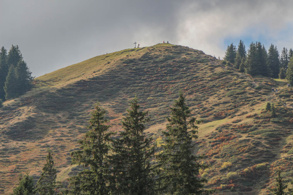Flotten Schrittes geht´s dann zurück Richtung Ofterschwanger Horn – nun ist das Gipfelkreuz völlig menschenverlassen. Also nochmal kurz die 60 Höhenmeter von der Fahnengehrenalpe rauf zum Kreuz. Gegen 16:15 Uhr genieße ich die letzte Gipfelpause für etwa zehn Minuten, nun schon bei bedecktem Himmel, es ist aber immer noch recht mild. Ist schon etwas anderes, in solcher Ruhe die Berge zu genießen, herrlich!
