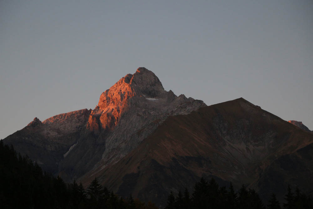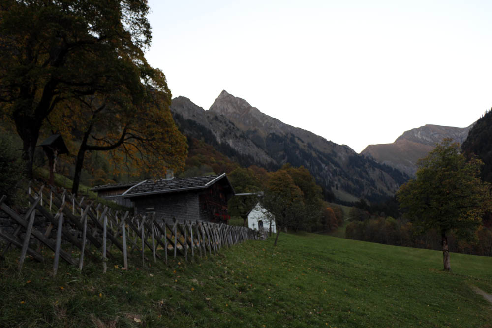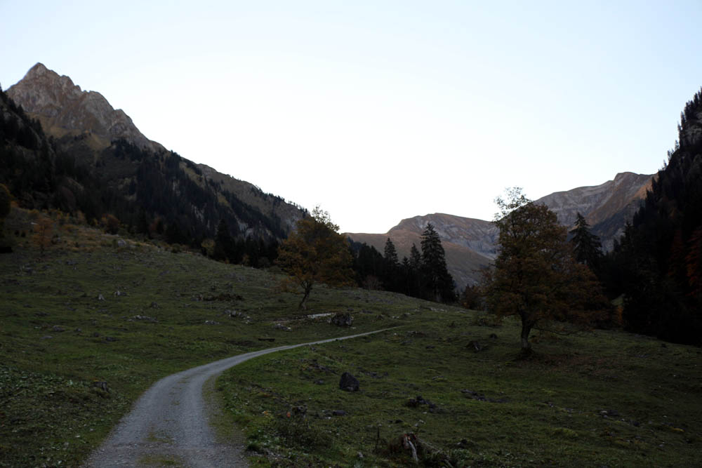 Um 6:00 Uhr starte ich in Hindelang und fahre über Sonthofen nach Oberstdorf. Westlich an Oberstdorf vorbei steuere ich den Parkplatz „Renksteg“ an und kann hier gegen 6:40 Uhr starten. Ein ungeheuer warmer Föhnwind weht durchs Tal – schön, dass man nicht frieren muss, wie es ja im Oktober um diese Uhrzeit auch sein kann. Ein fast kreisrunder Vollmond scheint herab und gibt ausreichend Licht. Über Asphalt geht’s Richtung Gertruben und ich kann schöne Blicke auf Kratzer und Trettachspitze genießen. Die Asphaltpiste nach Gerstruben ist, zumindest zu dieser Morgenstunde, nicht sonderlich reizend, macht nichts, das wird noch!!!