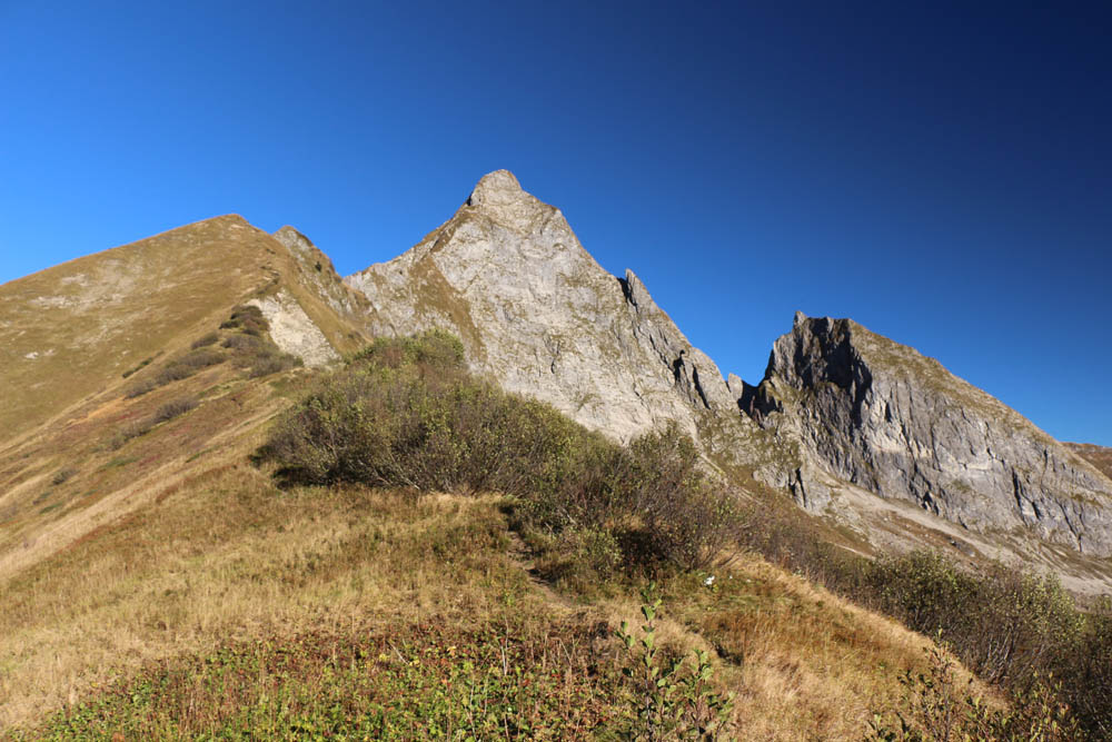 Steil geht es bergan, gut zu gehen, aber anstrengend. Runter sicher nicht so schön, dann so etwas Steiles lieber rauf. So macht man wenigstens Höhenmeter. Etwas schlapp fühle ich mich, liegt auch sicher daran, dass ich bis dato nüchtern unterwegs bin und nur vor der Abfahrt etwas getrunken habe. Spätestens um 9 Uhr will ich daher Pause machen, dann läufts irgendwie gut und ich sehe, dass der Älpelesattel näher rückt. Um 9:15 Uhr bin ich am Älpelesattel auf 1772 m und werde mit einer Wahnsinnsaussicht belohnt: besonders beeindruckend ist der Blick in die Bergwelt des Oytales mit der Wildengruppe, dem Himmelhorn mit dem messerscharfen Rädlergrat und natürlich der unmittelbar vor mir aufragenden Höfats. Zwei einheimische Jungs wollen noch auf deren Ostgipfel. Na dann, viel Erfolg!