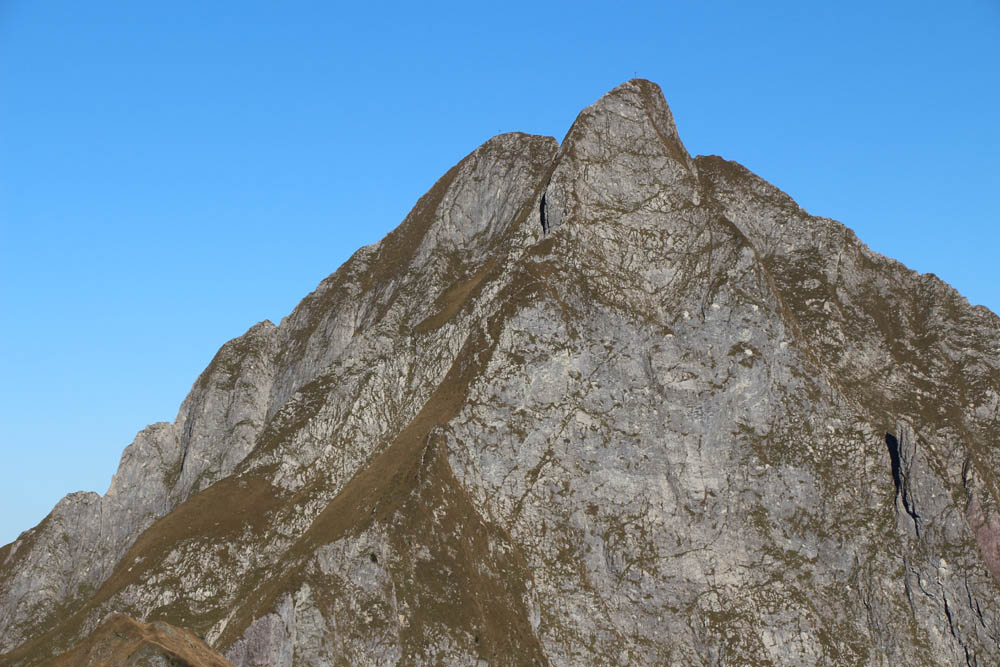Wer es sich zeitlich leisten kann, sollte es keinesfalls versäumen, den recht kurzen Abstecher auf den Fürschießer zu unternehmen: teils auf Pfadspuren, teils weglos kann ich meinen dritten Gipfel nach elf Minuten Aufstieg verbuchen. Da ich inzwischen bei Anstiegen (viele Aufstiegsmeter sind es ja zum Glück nicht) doch meine müden Beine spüre, hätte ich nicht gedacht, dass ich tatsächlich so rasch hier oben bin.