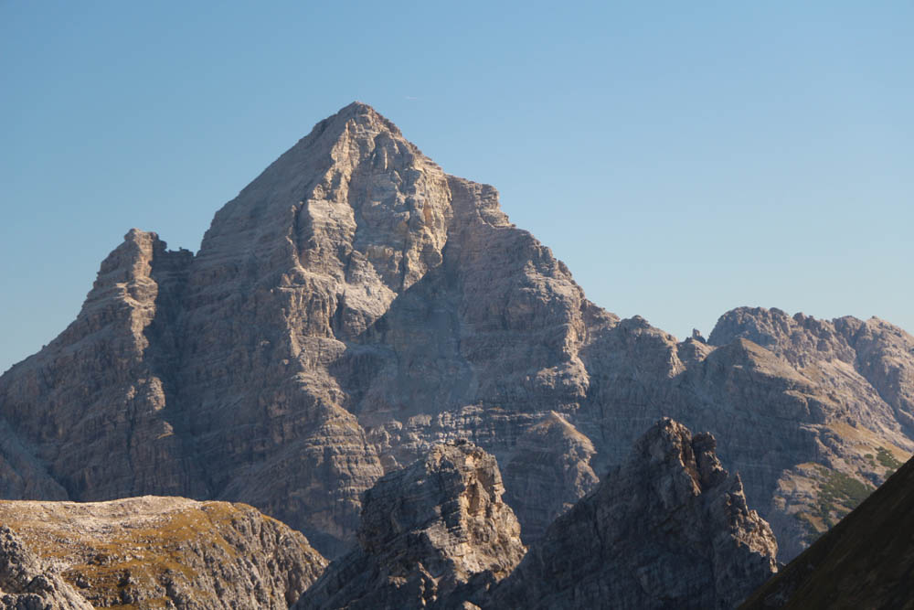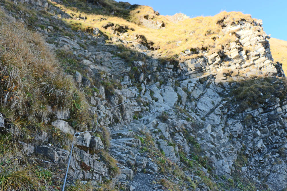 Um 12:55 Uhr erreiche ich das Schotterkar des Märzle auf 2206 m: hier wird eindrücklich sichtbar, dass es sich beim Hauptdolomit der Hornbachkette nicht um das verwitterungsresistenteste Gestein handelt. Trotz schattiger Nordlage sind keinerlei Schneereste zu sehen. Bis etwa Karmitte geht es ganz allmählich auf etwa 2140 m abwärts, dann wieder seicht aufwärts. Erst wenn man das Kar fast durchschritten hat, geht es etwas steiler hinauf zum Fürschießersattel. Hier sind die Seilversicherungen, die man an sich nicht wirklich braucht, aber dem etwas ungeübteren Wanderer Sicherheit geben, tatsächlich komplett neu. Wieder sonnig geht´s dann rasch zum 2214 m hohen Fürschießersattel, es ist 13:25 Uhr – eine halbe Stunde hat mich das Kar gekostet. Liegt aber auch an den vielen kurzen Fotostopps, die ich ständig mache: bis zum Tourende am Abend werden es knapp 300 Bilder sein. Meine Frau wäre alleine schon deswegen wahnsinnig geworden. Ich möchte nicht wissen, was mich die Entwicklung (und der Kauf) von sieben bis acht 36er-Fotofilmen (erinnert sich noch jemand) seinerzeit gekostet hätte.