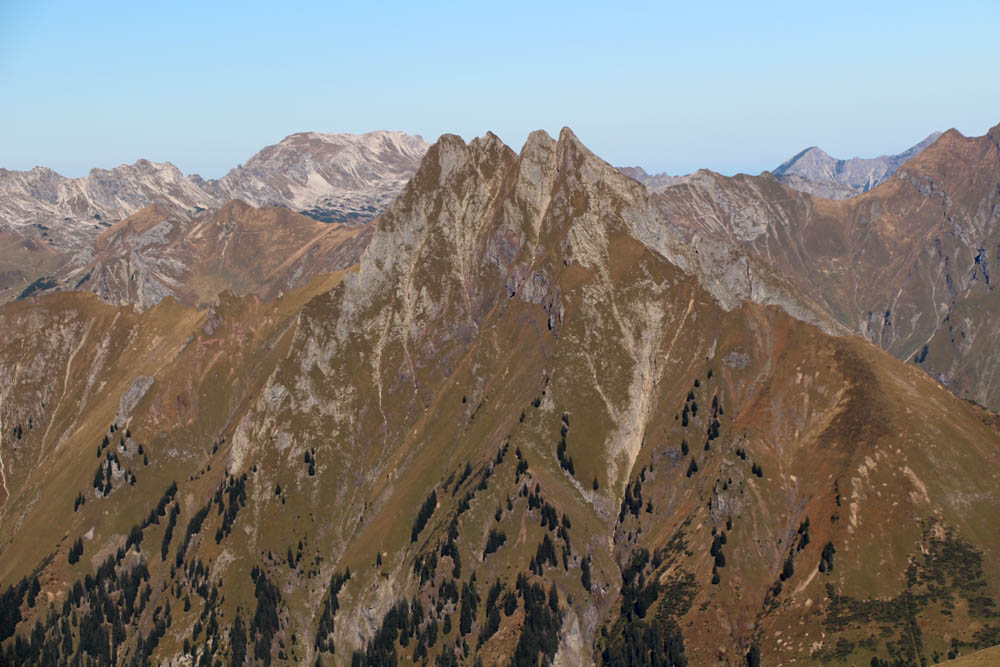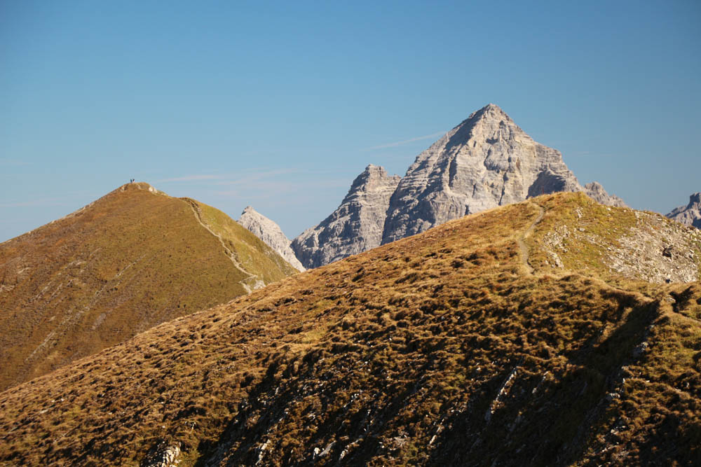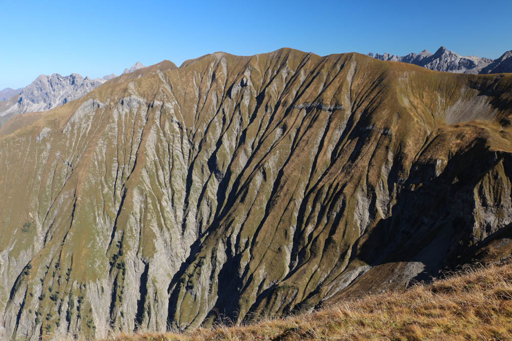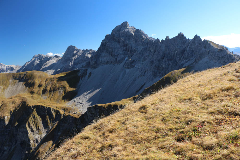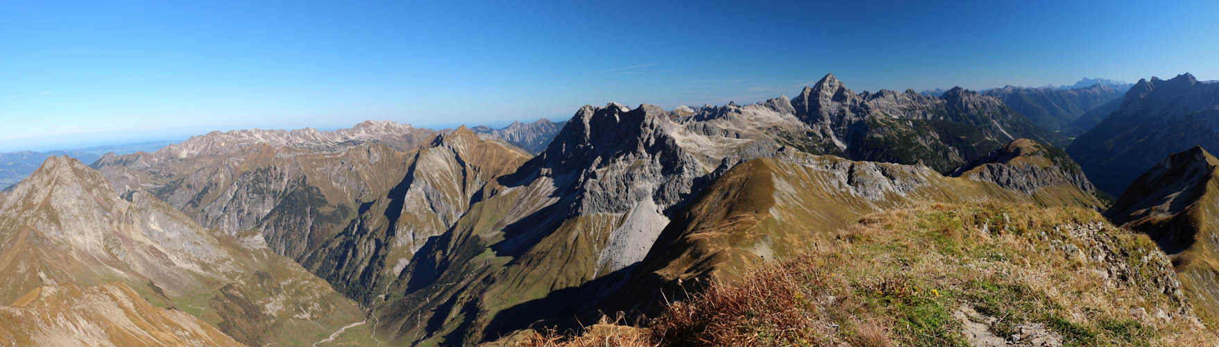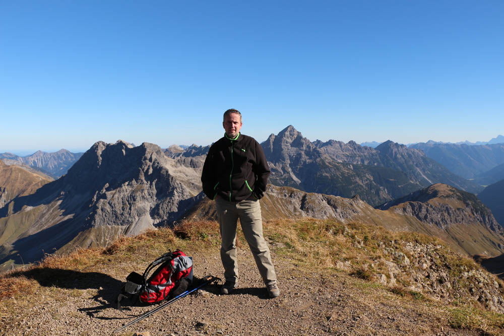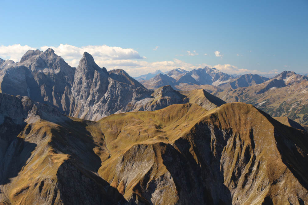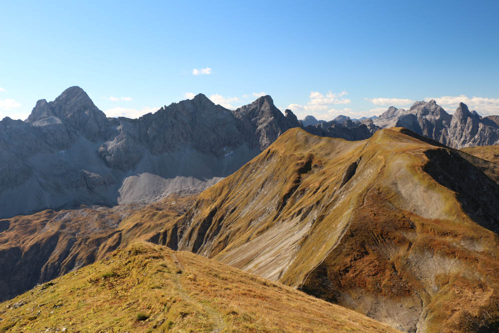 Die Aussicht ist auf jeden Fall fantastisch: im Norden dominieren die steilen Grasberge wie Höfats, Himmelhorn und Schneck, dann folgen Wildengruppe, Hochvogel, Zugspitze, die Berge rund ums Lechtal, bis weiter im Süden kein Weitblick möglich ist, weil man hier grandiose Nahblicke auf die Gipfel der Hornbachkette genießen darf. Im Westen schaut man bis zu Säntis und Bodensee. Auch hier oben weht es mitunter ganz gehörig (im Wetterbericht konnte ich nach der Tour von vorhergesagten Böen bis zu 70 km/h lesen, die sicher auch erreicht worden sind; das entspricht immerhin Windstärke 8 nach Beaufort), so dass man Probleme hat, den Fotoapparat ruhig zu halten. Zwischen den Böen wird es teilweise fast windstill, dann kann man die warme Herbstluft in vollen Zügen genießen (in Tallagen soll es bis zu 26°C werden - wir haben Anfang Oktober!!!)