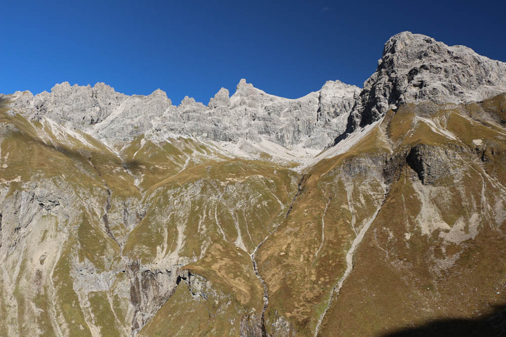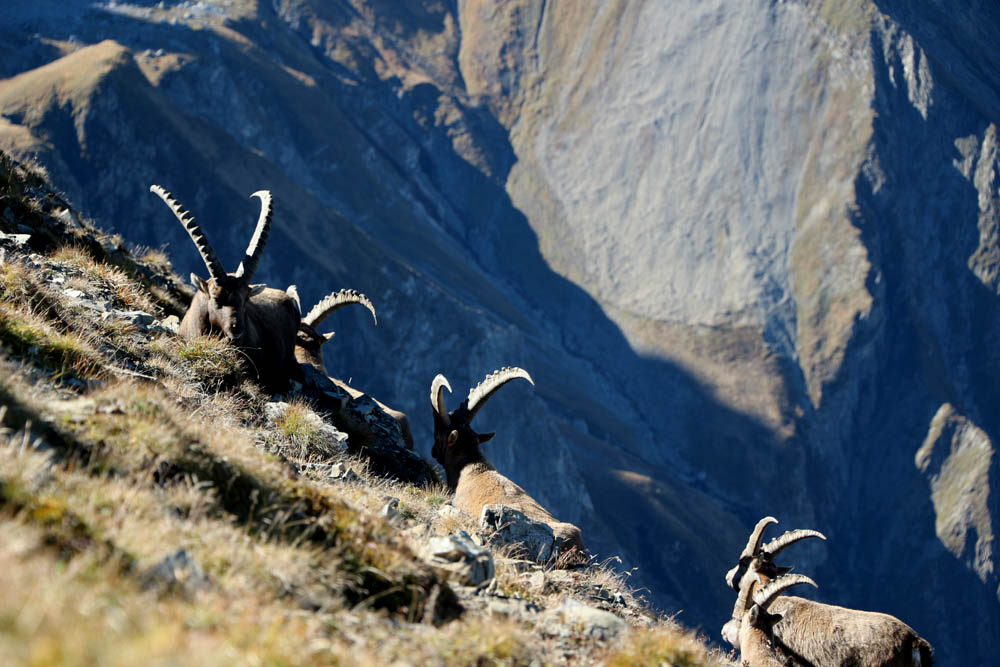 Ich gönne mir nochmals eine kleine Rastpause, mache Fotos und genieße die Aussicht. Nach einer Viertelstunde geht´s weiter Richtung Märzle. Angenehm zu gehen geht in leichtem auf und ab hinunter und dann kommt völlig unverhofft eine Gruppe Steinböcke ins Bild, die, mich uninteressiert beäugend, gemütlich dasitzt und sich natürlich von mir nicht nervös machen lässt. Was für ein majestätischer Anblick! Heute folgt auf ein Landschafts- bzw. Naturhighlight das nächste!
