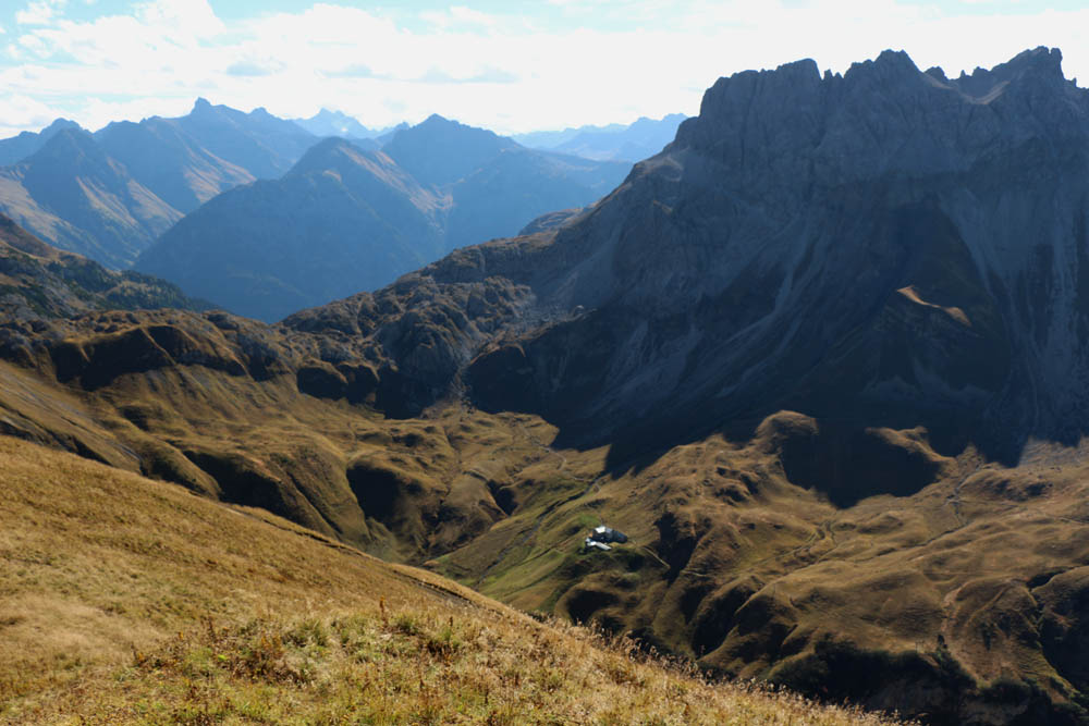 In einem weiten Bogen geht es bergab, während sich ständig schöne Blicke Richtung Kratzer und die Gipfel der Hornbachkette wie Großer Krottenkopf, Muttler und Krottenspitzen bieten. Eine Tour, die sich schon jetzt über alle Maßen gelohnt hat! Kurz nach 15 Uhr bin ich, nach etwa einstündigem Abstieg ab Fürschießersattel, an der Kemptner Hütte auf 1844 m. Klar, dass jetzt ein Radlermaß als Lohn für die strapazierten Beine fällig ist! Ich mache es mir also auf der schon im Schatten liegenden Terrasse gemütlich, genieße Bier, Aussicht und die Tatsache, dass eine genial-schöne Tour (fast) hinter mir liegt.