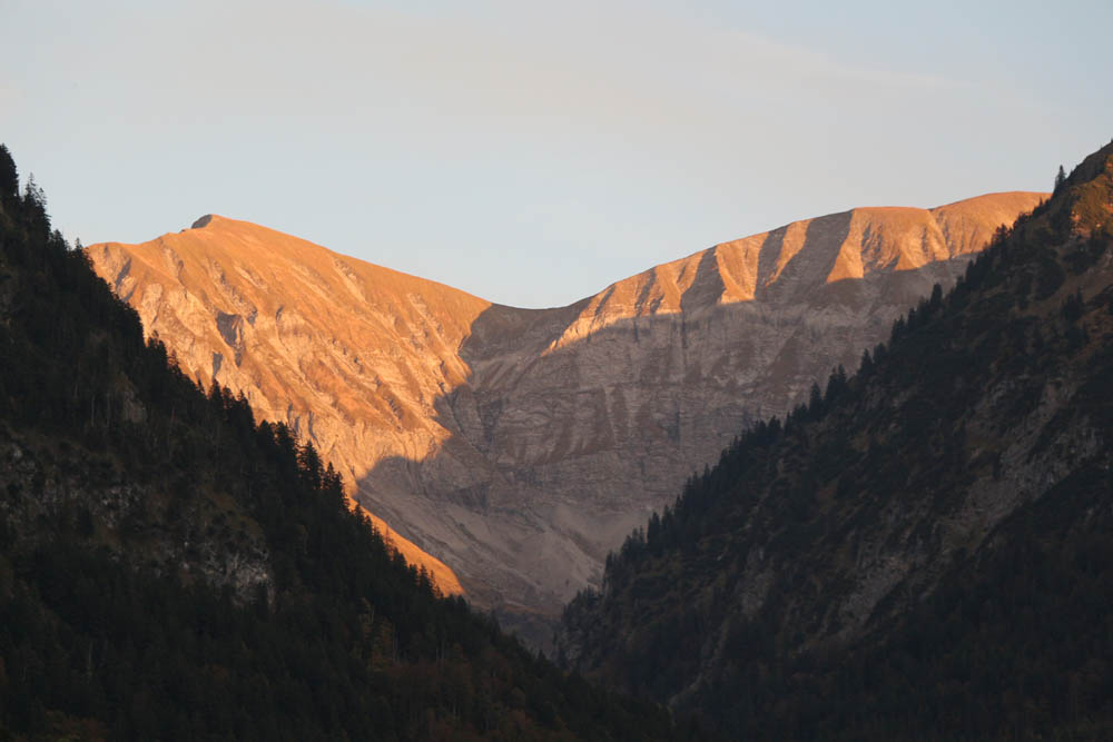 Nach einer halben Stunde gemütlicher Rast nehme ich den Abstieg durch den Sperrbachtobel in Angriff. Auch hier immer wieder Fotopausen, da mich die gefalteten Felsen zu beiden Seiten des Tobels faszinieren. Zumeist im Schatten, aber bei immer noch angenehmen Temperaturen steige ich tiefer, habe schließlich den eigentlichen Tobel hinter mir. Es geht, immer noch einige Höhenmeter oberhalb der Talsohle, talauswärts, bis ich schließlich den Talboden erreiche. Dann ist es auch nicht mehr weit, bis ich um 17:30 Uhr am Gasthof Spielmannsau (983 m) ankomme. Der letzte Bus geht erst in 40 min., was nun? Pause oder per pedes? Zu Fuß! Mal schauen, was noch geht. Zügig spaziere ich talauswärts, an der Straße entlang, um nicht noch unnötige Umwege zu machen und eventuell doch noch die Alternative Bus zu haben. Bis zur nächsten Haltestelle Christlesee (920 m) ist´s ein ordentliches Stück und als ich dort nach 25 min. ankomme, reicht´s mir. Schluss für heute! Ich warte auf den 18:13 Uhr-Bus und lasse mich für 2,10 Euro zum Parkplatz Renksteg fahren. Da komme ich dann auch gerade noch rechtzeitig an, um die wunderschöne Abendsonne auf dem Rauheck zu sehen. Nach fast zwölf Stunden bin ich wieder am Auto.