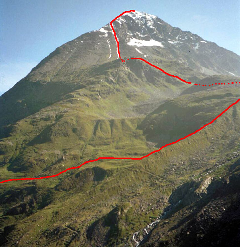 | Gehzeiten lt. Wegweiser | Hütte - Gipfel 4,5 Std. laut Website der Hütte! | Übersicht: Ungefährer Wegverlauf auf den Gipfel. Der Buckel in direkter Falllinie des Gipfels ist das "Hohe Egg" (2820 m). Das Bild wurde wenige Tage vor der Tour aufgenommen - man sieht eine fast schneefreie Aufstiegsroute - durchaus sehr gute Bedingungen, die wir damals vorfanden. Eine Wanderkarte gibt es hier! In pink unsere Route, die von den meisten Gipfelaspiranten genutzt wird. Resumee: |