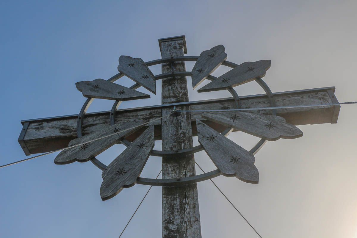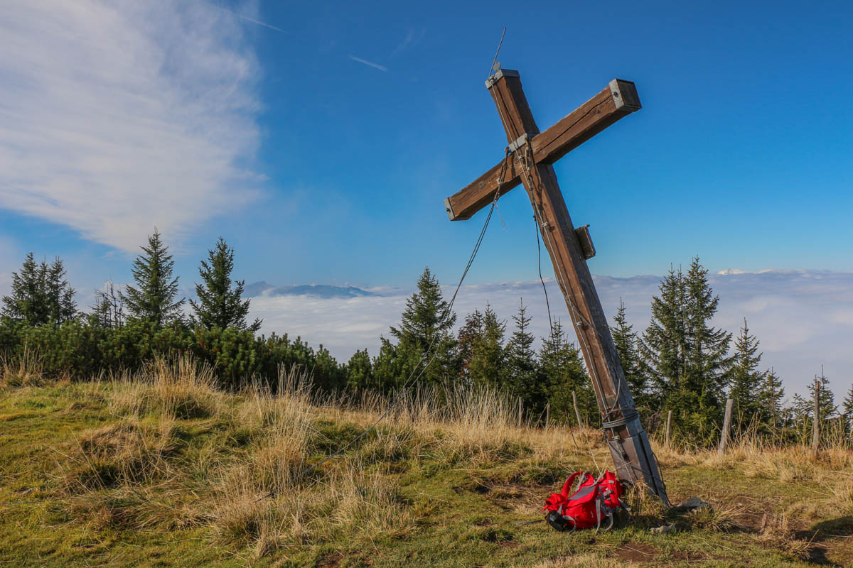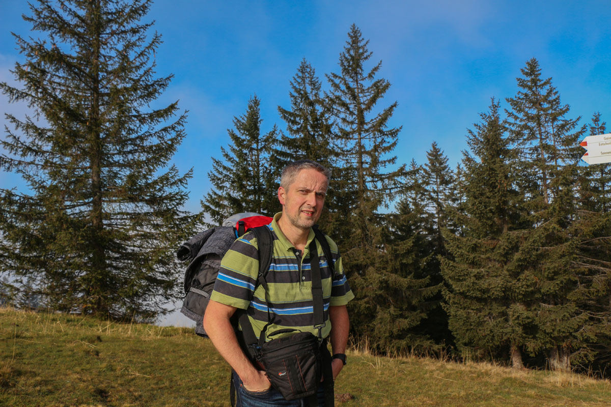 Wir machen Fotos und schauen in die Runde. Ich kann Tobias schnell überreden, dass wir erst auf dem nahen Gipfel gemütliche Rast einlegen, denn weit ist es nun nicht mehr. Vom Sattel brauchen wir dann auch tatsächlich nur etwa zehn Minuten und wir stehen auf dem ersten Gipfel des Tages, dem Sonnenkopf (1712m). Der Gipfel ist gerade so hoch genug, dass uns freie Blicke auf die umliegenden Berge gelingen, doch leichter Wind treibt immer wieder Nebelschwaden zu uns herauf und wir sehen nichts mehr. Egal, wir rasten erst einmal gemütlich und genießen es, gemeinsam hier zu sein.