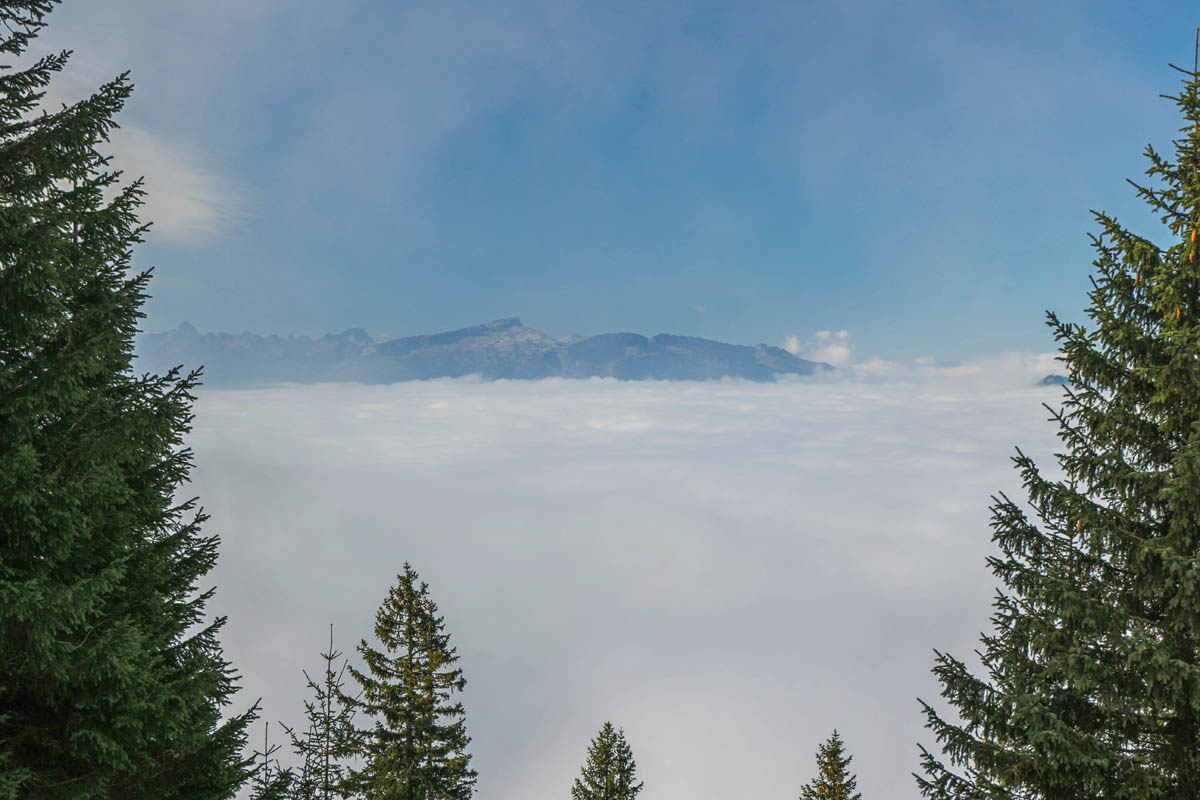 An der Falkenalpe (1697 m) hat uns der Hochnebel wieder. Geradeaus geht es in Richtung Gaisalpe weiter, was bei den Wolken ein unnötiger Umweg zur Sonnenklause wäre. Rechts abbiegend geht es direkt zu unserem Ziel. Auf gutem Weg wandern wir also talwärts, sind um 13 Uhr an der Entschenalpe (1400 m laut Beschilderung) und erreichen zwanzig Minuten später die Wolkenuntergrenze: der Blick wird wieder frei, die Sonnenklause ist schon zu sehen. Das letzte Stück flach dahinspazierend sind wir um 13:45 Uhr wieder am PKW und fahren zurück nach Bad Hindelang.