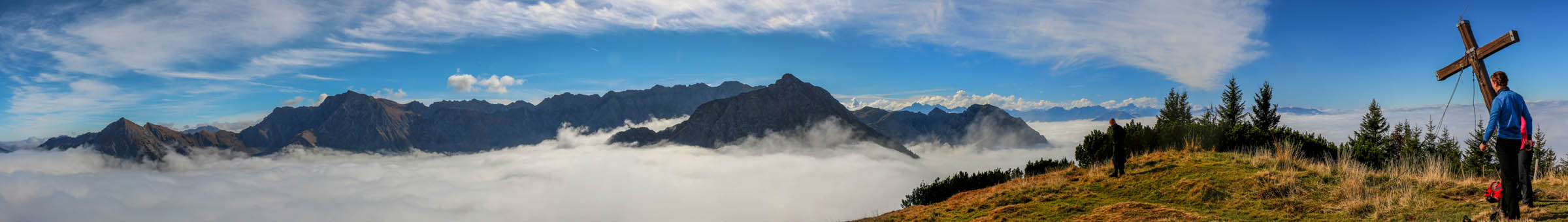 Gegen 11:40 Uhr sind wir auf dem Schnippenkopf, mit 1833 m der höchste Punkt unserer Runde. Der Schnippenkopf-Gipfel ist zum Glück hoch genug, um die Wolken klar unter sich zu lassen: endlich ein uneingeschränkter Rundblick, und was für einer! Ein grandioses Panorama auf den gegenüberliegenden Daumenzug und die Nebelhorngruppe samt Nahblick zum Entschenkopf einerseits, Fernnblicke auf den Allgäuer Hauptkamm und das Kleinwalsertal andereseits. Viel liegt aber eben auch unter dem Wolkenmeer, so Nagelfluhkette, die Ostrachtaler Berge usw.