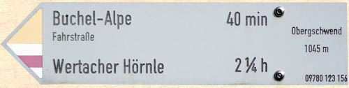 Beim Bäcker Kirchebäck kaufen wir noch etwas Proviant und fahren dann über die Jochstraße nach Oberjoch, durch den Ort weiter Richtung Unterjoch, bis wir den Parkplatz in Obergschwend erreichen. Ab hier sollen es 40 min. bis zur Alpe und 2:15 Std. bis zum Gipfel sein - man wird sehen, stressen wollen wir uns auf keinen Fall: ich freue mich auf ein Ausflugsziel, welches mir mit über 20 Urlauben im Allgäu noch neu ist und Tobias soll sich natürlich auf seiner ersten Bergtour nicht total verausgaben. Um 9:20 Uhr können wir starten.