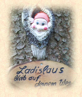 Auf der Fahrstraße kommen wir rasch voran - es ist noch kühl, aber das es ein schöner Tag wird, daran besteht kein Zweifel. Als wir den ersten Zwerg entdecken entscheiden wir uns natürlich, die Straße zu verlassen und durch den Wald diverse Straßenkehren abzukürzen. Und mit "Ladislaus" entdecken wir auch einen Zwerg, den wir am Vortag nicht gesehen hatten.