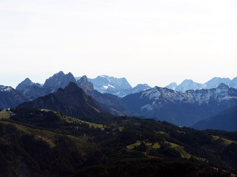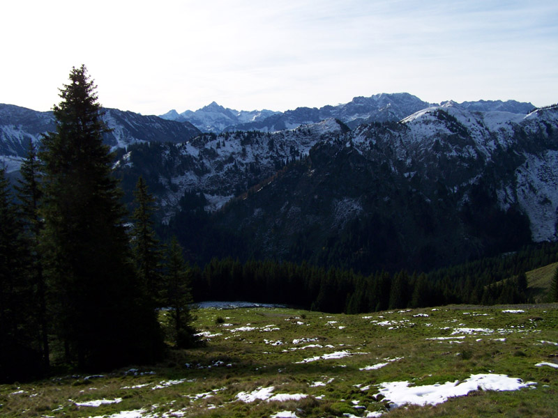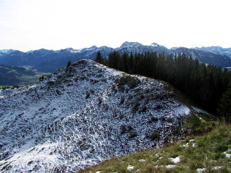Blick Richtung Süden auf den Kühgundrücken und das Ornachmassiv. Hinten der Hochvogel, rechts daneben der Große Daumen.