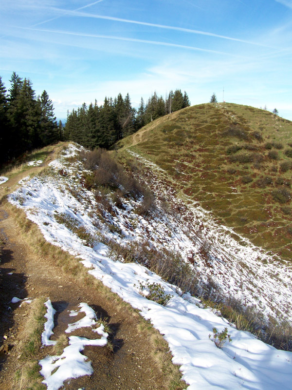 So sind wir alsbald an meinem Umkehrpunkt vom Frühjahr und wenig später im Wald. Die ersten Meter sind hier recht matschig und rutschig, aber die Verhältnisse werden rasch wieder besser. Durch die Wanderkarte wissen wir, dass es eine Weile durch den Wald bergauf geht, aber Tobias und ich unterhalten uns so gut, dass die Zeit im Nu verfliegt und wir rascher als gedacht wieder in der Sonne stehen bzw. gehen. Hier öffnet sich der Blick auch in Richtung Tannheimer Tal und auch Richtung Süden. Der Hochvogel kommt ins Bild. Nach und nach wird die Sicht umfangreicher. Das Gelände öffnet sich und wir sehen über uns einen Weidezaun - wenn wir den erreicht haben, dürften es nicht mehr allzu viele Höhenmeter sein.