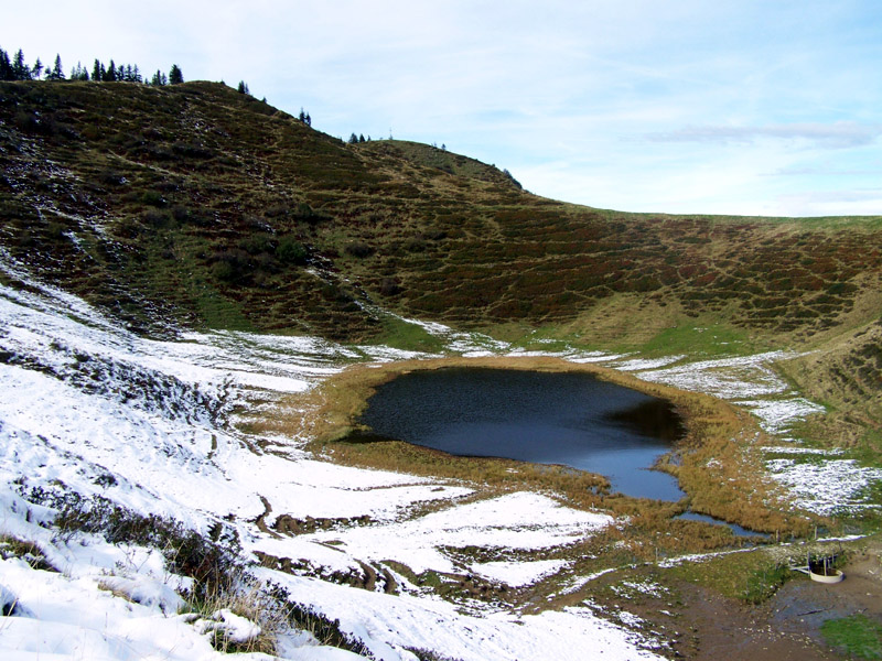 So etwa gegen 10:45 Uhr erreichen wir den Weidezaun und damit flacheres Gelände. Aufgrund des Schlechtwetters vor einer Woche ist das Gelände hier oben sehr matschig und nass - wir müssen gut schauen, wohin wir treten, damit unsere Schuhe nicht klatschnass werden. Als es wieder vorübergehend etwas steiler bergauf geht und wir den idyllisch gelegenen Hörnlesee passiert haben, wird der Boden wieder trockener und weit ist es nun ohnehin nicht mehr.