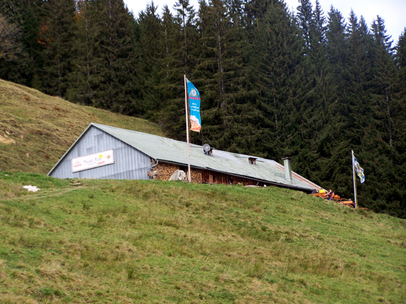 Ab hier geht es nochmals steil hinab, bis wir dann um 13:10 Uhr die Alpe erreichen und uns natürlich mit Kaltgetränken belohnen: für Tobias gibt’s eine große Spezi, für mich eine Hopfenkaltschale. Wir genießen unsere Pause in der Sonne und wollen uns nach wohlverdienter Erfrischungspause wieder auf den letzten Wegabschnitt machen. Die Alpe ist gut besucht und der Besuch lohnt: die Gehzeit ab Parkplatz mit vielleicht 45 Minuten bei sehr gemütlichem Tempo gering und die Aussicht einfach toll! Im Übrigen ist die Bedienung sehr freundlich – man fühlt sich wohl!
