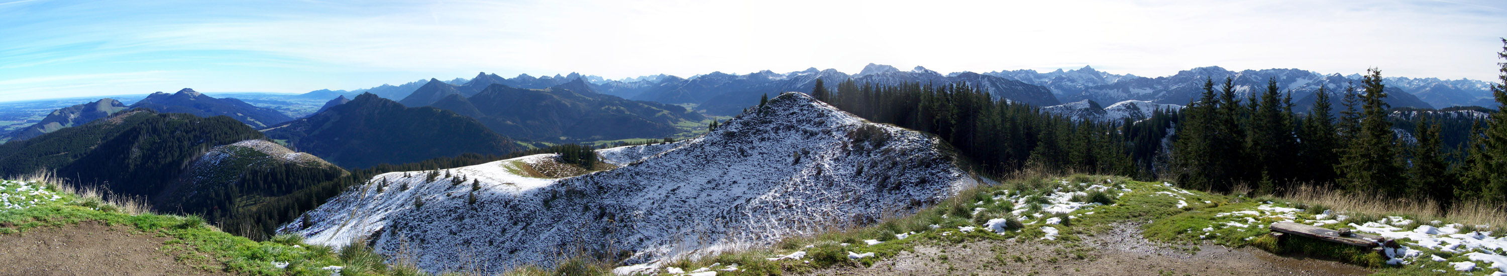 Gipfelpanorama - es reicht von den Pfrontner Bergen ganz links über das Tannheimer Tal, die Rauhhornkette und Hochvogelgruppe bis zur Daumengruppe und zum Illertal rechts.