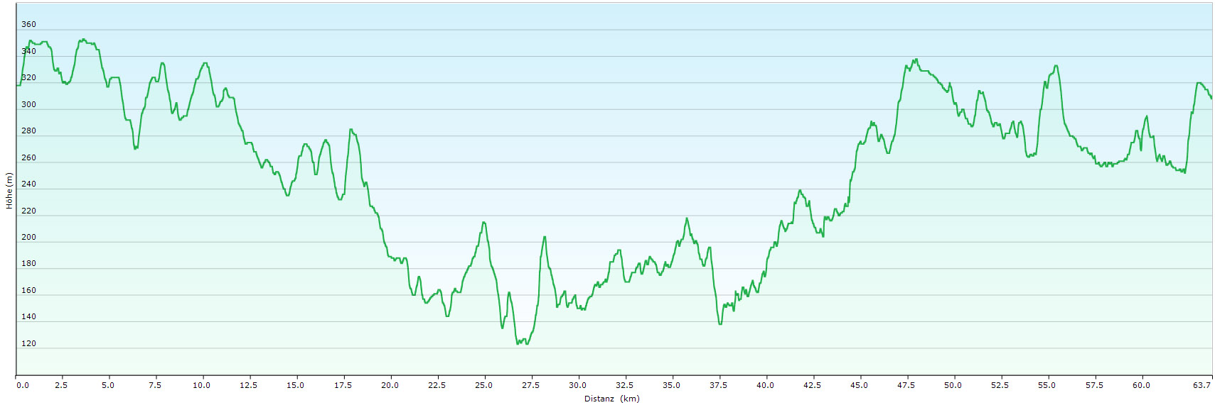 Kurz hinter km 47 eine weitere Verpflegungsstelle, dann geht es kilometerlang ganz seicht, kaum zu merken, bergab. Eine Wohltat! Doch mein linker Oberschenkel meldet sich mit einem Krampf. Scheiße, nicht jetzt! Ich muss stehen bleiben, zum Glück kann mir ein Läufer, der mich alsbald erreicht, mit zwei Magnesiumtabletten aushelfen. Ich lasse die kleinen Dinger im Mund zergehen und der Krampf verabschiedet sich allmählich. Ob nun durchs Magnesium oder nicht, es geht wieder. An der nächsten Verpflegung bei km 53,5 gibt’s neben dem „Üblichen“ ein paar Stücke Currywurst und ein halbes Glas Bier. Für die Seele! Hier bin ich dem Ziel näher als dem zurückliegenden Zwischenziel bei km 42,2. Jetzt sollte mich nichts mehr aufhalten. Trotzdem: meine km-Splits liegen in der Regel über 8 min., so dass ich in einer halben Stunde nicht mal vier Kilometer schaffe. Heftig! So wird die Reststrecke im Kopf noch länger.