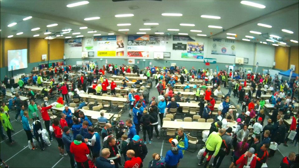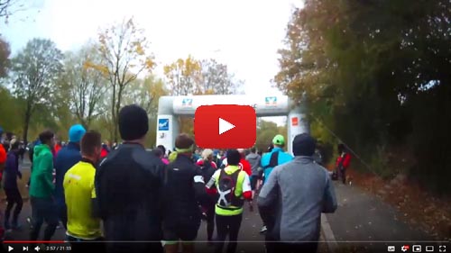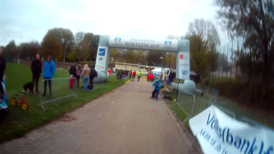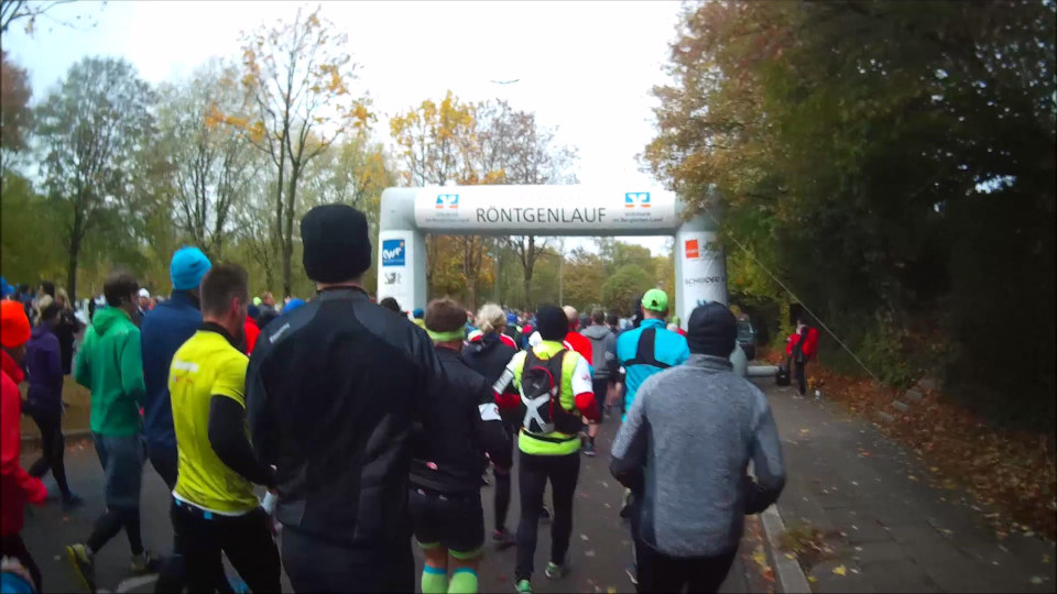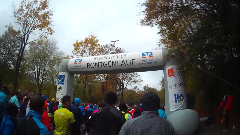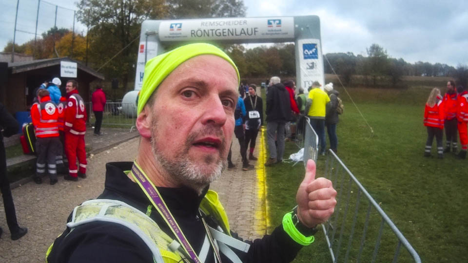 Am Morgen des 28. Oktober dann trotz Nervosität und dank Zeitumstellung gut ausgeruht um 5:30 Uhr aufgestanden, gefrühstückt, die schon bereitliegenden Sachen gepackt und gegen 6:20 Uhr mit dem Auto los. Auf recht leeren Straßen nach Remscheid und mit dem Shuttlebus zum Start. Dort hatte ich Zeit, mich bei frischen 4°C in der Messehalle umzuschauen und ein paar Röntgen-Andenken zu kaufen. Ich treffe noch Marathon-Urgestein Gerd Junker vom „Marathon Club 100“, der inzwischen über 500 MaraUltras gelaufen ist. Heute läuft er nur den Marathon, sagt mit einem Lächeln und wünscht mir viel Spaß. Erst kurz vor dem Start bin ich dann raus in die Herbstkälte und an die Startlinie, wo sehr pünktlich um 8:30 Uhr der Startschuss zum 18. Röntgenlauf fällt.