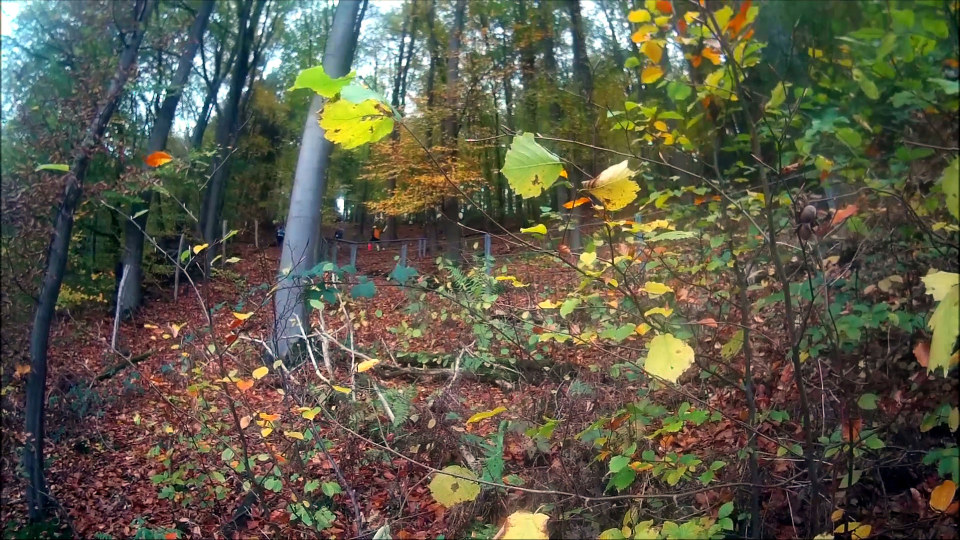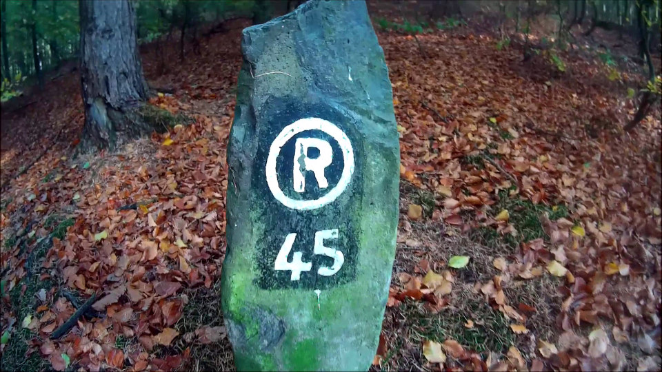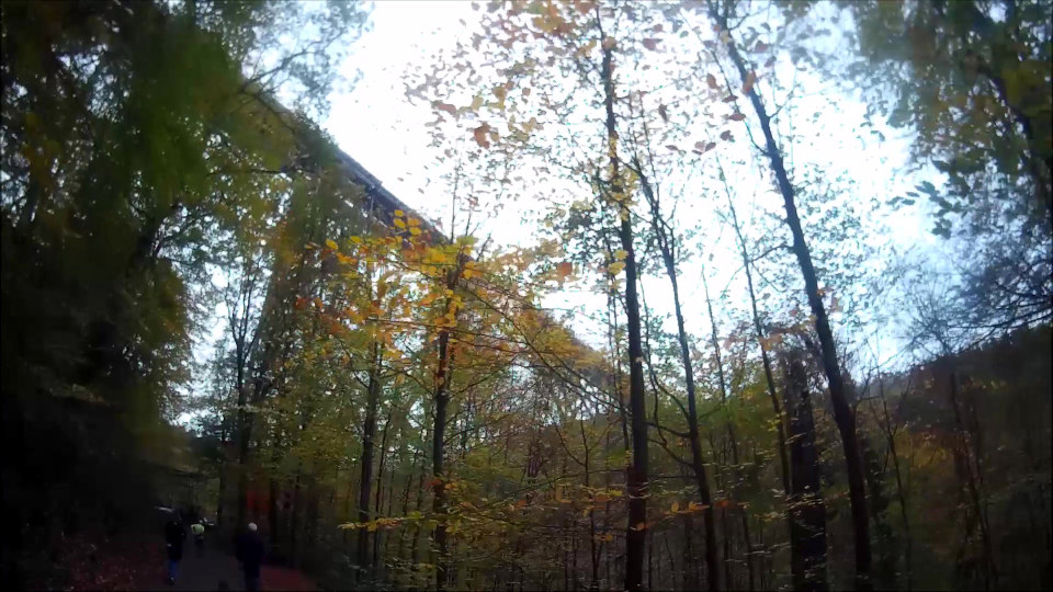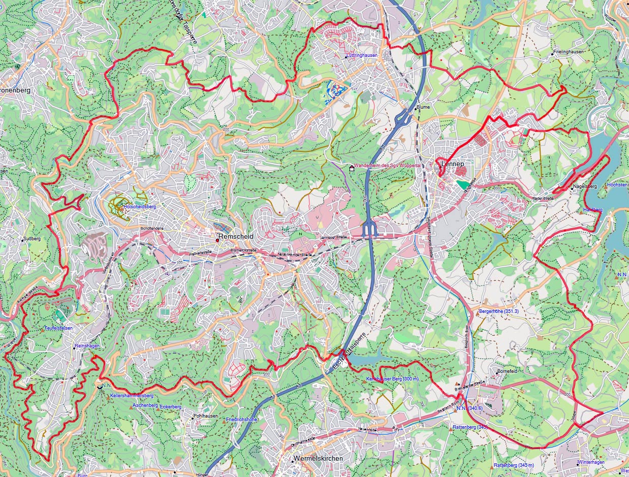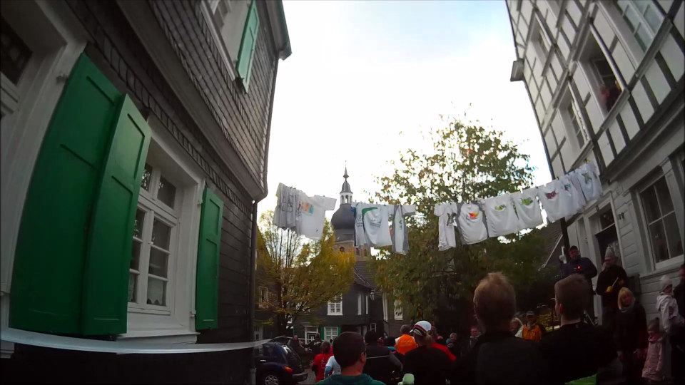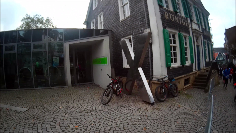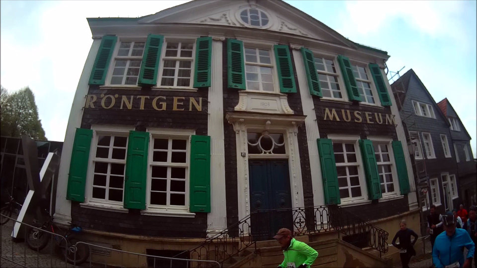 Zuerst geht es in einer kleinen Schleife durch den hübschen Altstadtkern von Remscheid-Lennep, wo ich einen Blick auf das Geburtshaus von Wilhelm Conrad Röntgen werfen kann, der 1845 hier geboren wurde (und 1901 als erster Physiker überhaupt den Physik-Nobelpreis erhält). Unweit das Röntgen-Museum, in dem man sich ausführlich über die X-Strahlen, wie sie Röntgen selbst nannte (und im englischsprachigen Raum ja auch immer noch genannt werden) informieren kann. Bei etwa km 5,5 verlasse ich die Ortschaft und kann schöne Blicke ins umliegende Hügelland werfen. Der Lauf macht im Übrigen der Tatsache, dass er im Bergischen Land stattfindet, von Beginn an alle Ehre: es geht permanent rauf und runter, wo, das weiß ich, im ersten Abschnitt die bergab-Meter überwiegen werden. Doch das Wetter ist prima, besser als vorhergesagt: die Sonne kommt immer wieder mal durch, dazu die kühle Luft, der laubbedeckte Boden trocken – an sich soweit perfekt. Steilere Aufstiegsmeter laufe ich nicht, sondern gehe zügig bergan: das ist deutlich kräftesparender und nur wenig langsamer.