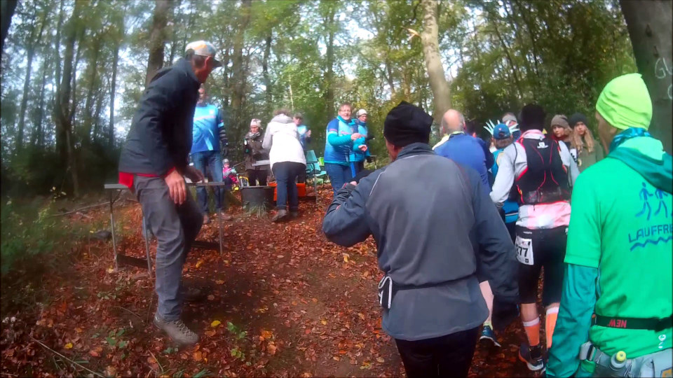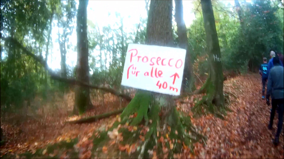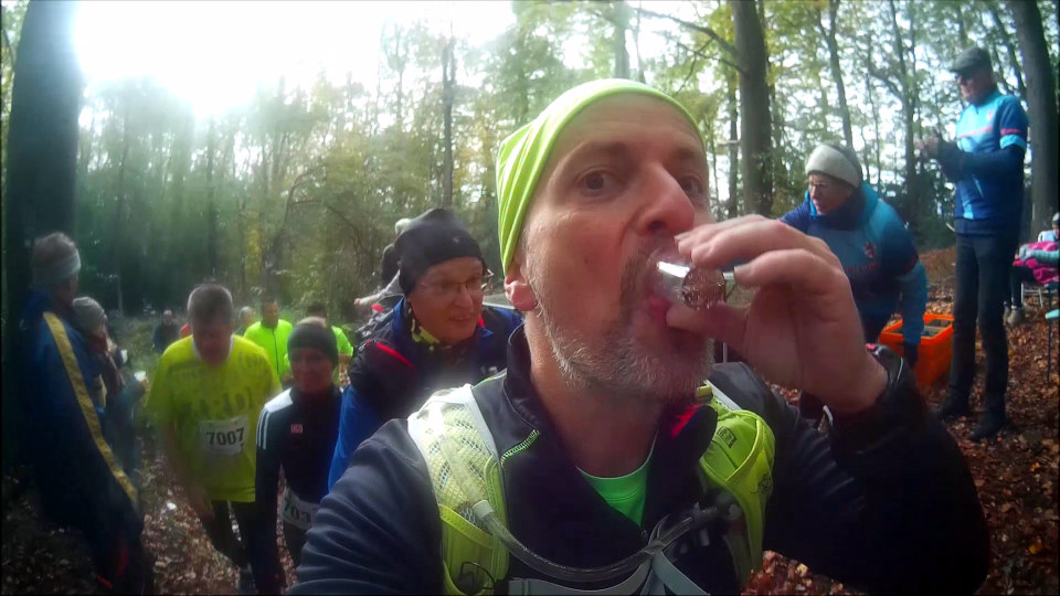 Den steilen Anstieg vor km 18 steigen wir in einer langen Schlange bergauf, was oben wartet weiß jeder: die berühmte Prosecco-Bar: ein Schlückchen Sekt für jeden. Darauf hatte ich mich schon gefreut, der „Verpflegungs-Stand“ ist Kult. Durch idyllische Wälder geht’s weiter, bis ich nach 2:20 Std. das Halbmarathonziel am Clemenshammer erreiche. Gute Stimmung hier, doch es geht natürlich sofort weiter. An der nächsten Verpflegungsstation gibt es zu meiner Überraschung leckere Schmalz-Schnittchen. Jetzt stellt man sich also allmählich auf die Bedürfnisse der Ultradistanz-Aspiranten ein, lecker.