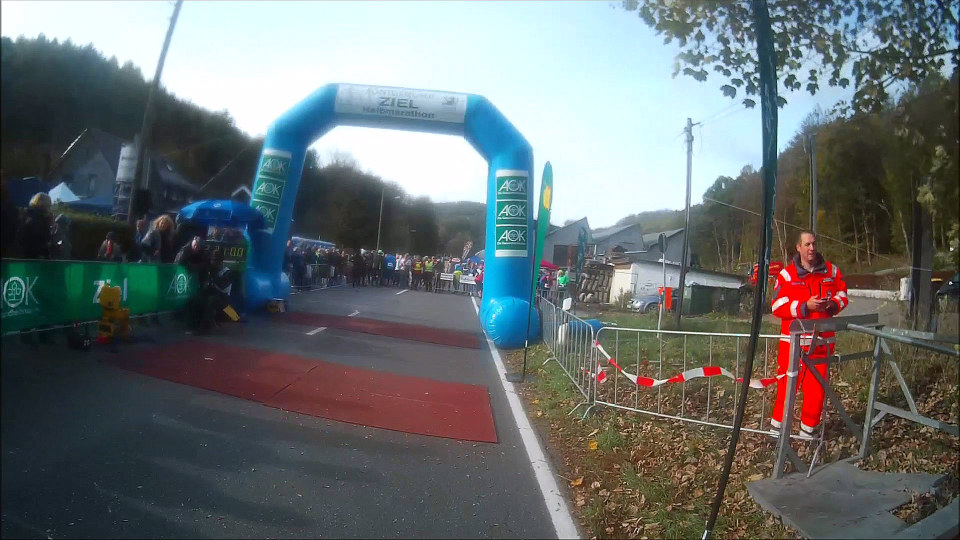 Wenig später tatsächlich das so lang ersehnte km 60-Schild – geil! Sieht cool aus, bislang war ich immer froh, wenn eine „40“ auf einem Kilometerschild zu sehen war. An der Talsperre entlang geht es nochmals rauf und dann endlich auf´s Sportgelände Hackenberg. Vor der letzten Kurve sehe ich schon das Zieltor, dann direkt vor mir. Die Zuschauer, die ausgeharrt haben, klatschen, der Sprecher am Mikro begrüßt mich. Zieldurchlauf, die so harte erkämpfte Medaille, ein alkoholfreies Bier. Nicht zu fassen, nach 08:06:10 Stunden habe ich die 63,3 km hinter mich gebracht. Meine Beine können nicht mehr und so humple ich langsam in die Meldehalle, wo noch eine Tasche von mir lagert. Bei den Massagebänken ist gerade wenig los, so lasse ich spontan meine Beine durchkneten. Vielleicht hilft´s ja. Dann umziehen, Dusche gibt´s daheim und ganz langsam zum Shuttlebus: ein beheizter Sitzplatz, herrlich! Der Bus bringt uns in wenigen Minuten zurück zum Parkplatz, wo nicht mehr allzu viele Autos stehen. Ich verstaue die Sachen und fahre glücklich und total platt heimwärts.